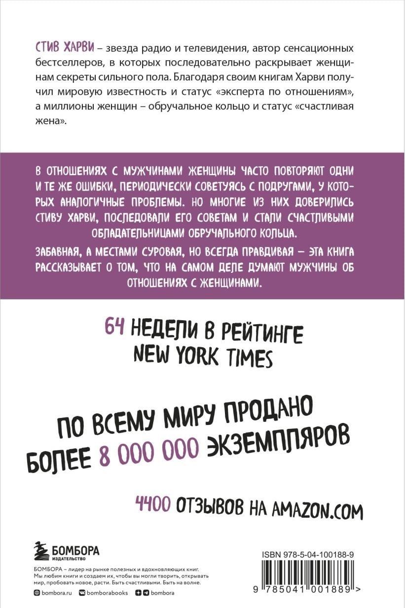 В этой книге Стив Харви дает прекрасную возможность понять ход мыслей представителей сильного пола, отвечая на множество наболевших вопросов. Например, таких: «Что вы должны, а что не можете требовать от своего мужчины?», «Как распознать маменькиного сыночка и что делать в этом случае?», «Когда знакомить кавалера со своими детьми?», «Какие пять вопросов нужно задать мужчине, чтобы определить серьезность его намерений?».