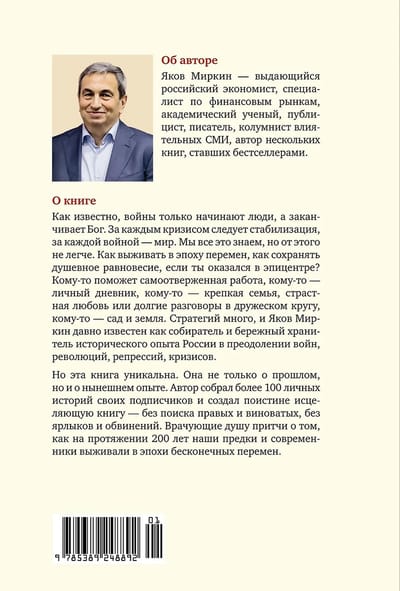 Яков Миркин давно известен как собиратель и бережный хранитель исторического опыта России в преодолении войн, революций, репрессий, кризисов. Он выстроил целую портретную галерею политиков, ученых, деятелей культуры, по-разному реагировавших на стресс. Но эта книга уникальна. Она не только о прошлом, но и о нынешнем опыте. Автор собрал более 100 личных историй своих подписчиков и создал поистине исцеляющую книгу – без поиска правых и виноватых, без ярлыков и обвинений. Врачующую душу книгу о том, как на протяжении 200 лет наши предки и современники выживали в эпохи бесконечных перемен.