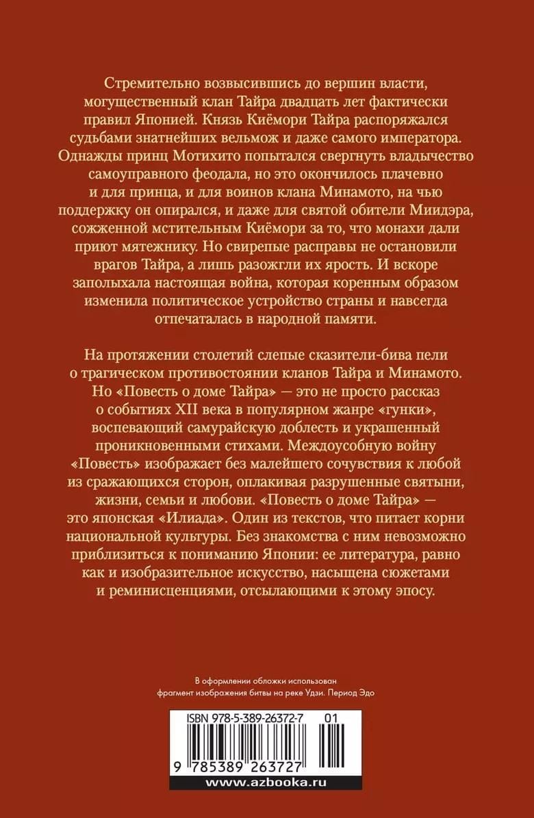 Стремительно возвысившись до вершин власти, могущественный клан Тайра двадцать лет фактически правил Японией. Князь Киёмори Тайра распоряжался судьбами знатнейших вельмож и даже самого императора. Однажды принц Мотихито попытался свергнуть владычество самоуправного феодала, но это окончилось плачевно и для принца, и для воинов клана Минамото, на чью поддержку он опирался, и даже для святой обители Миидэра, сожженной мстительным Киёмори за то, что монахи дали приют мятежнику. Но свирепые расправы не остановили врагов Тайра, а лишь разожгли их ярость. И вскоре заполыхала настоящая война, которая коренным образом изменила политическое устройство страны и навсегда отпечаталась в народной памяти. На протяжении столетий слепые сказители-бива пели о трагическом противостоянии кланов Тайра и Минамото.