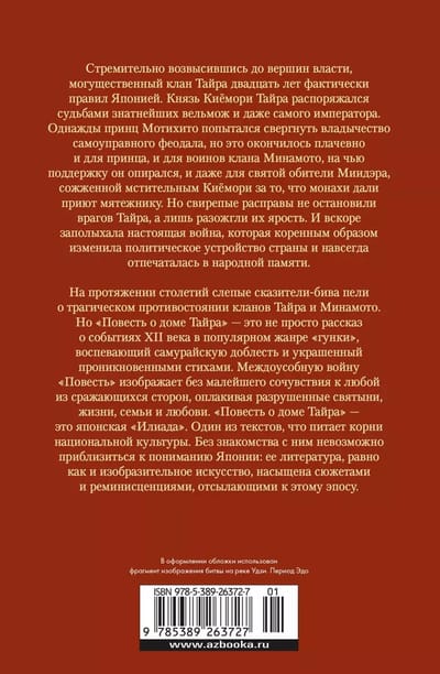 Один из текстов, что питает корни национальной культуры. Без знакомства с ним невозможно приблизиться к пониманию Японии: ее литература, равно как и изобразительное искусство, насыщена сюжетами и реминисценциями, отсылающими к этому эпосу. В оформлении настоящего издания использованы иллюстрации из старопечатных и рукописных книг и свитков, а также ксилографии художников стиля укиё-э и изображения с предметов декоративно-прикладного искусства Японии.
