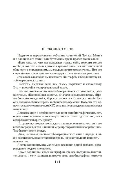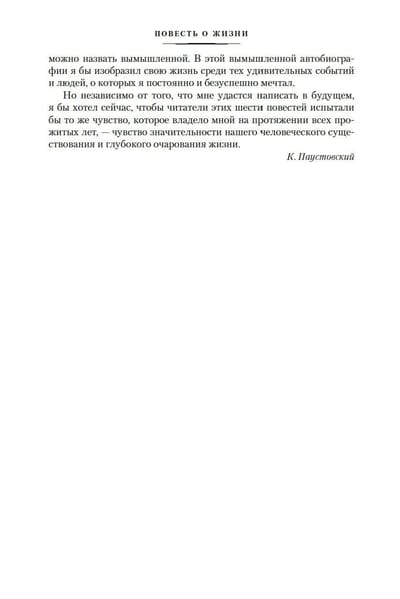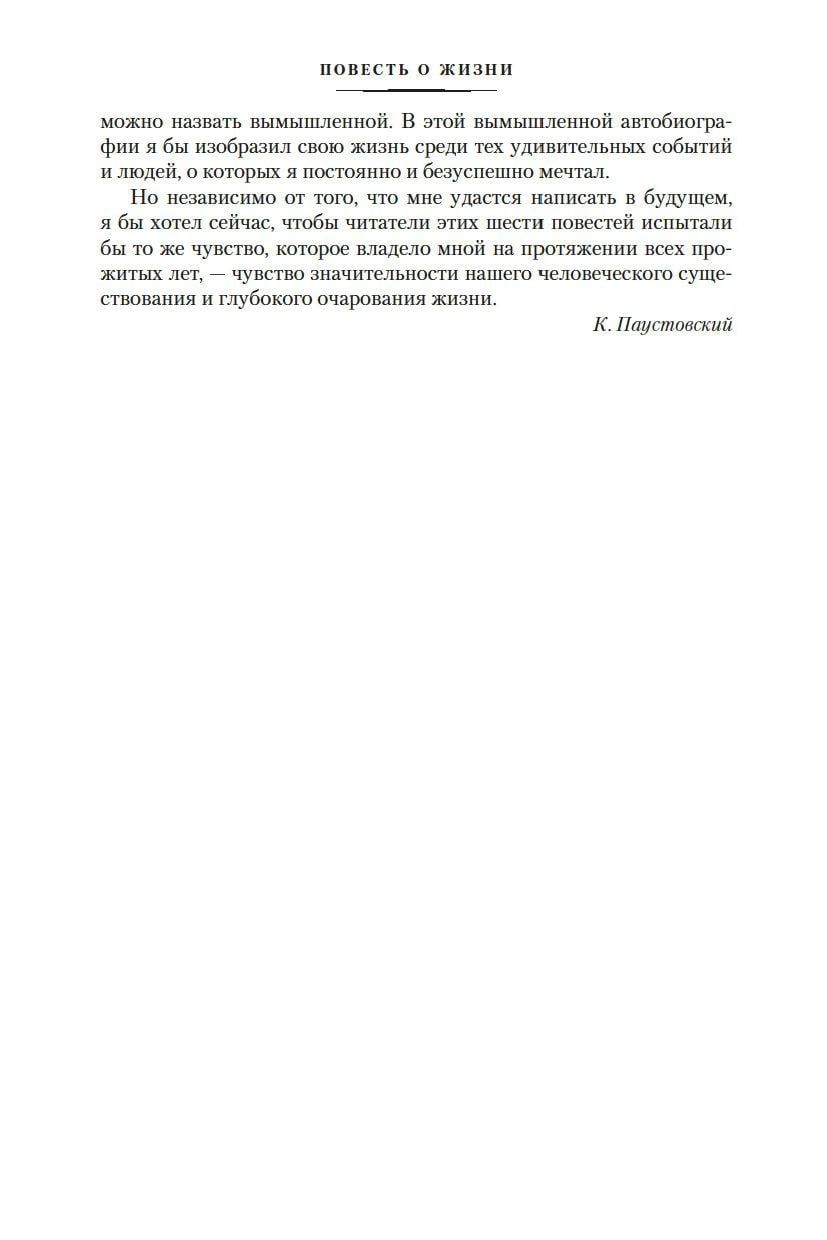 Над «Повестью о жизни», одним из главных своих произведений, Паустовский работал 18 лет. По словам Константина Кедрова, «в первых главах «Повести о жизни» Бунин угадал возрождение русской литературы». Перед нами проходит жизнь писателя — с детских лет и до того времени, когда он осознает свой литературный успех. Автобиографизм, интимно-личное соединяются здесь с историческим и общезначимым, размышления о прошлом — с днем сегодняшним.