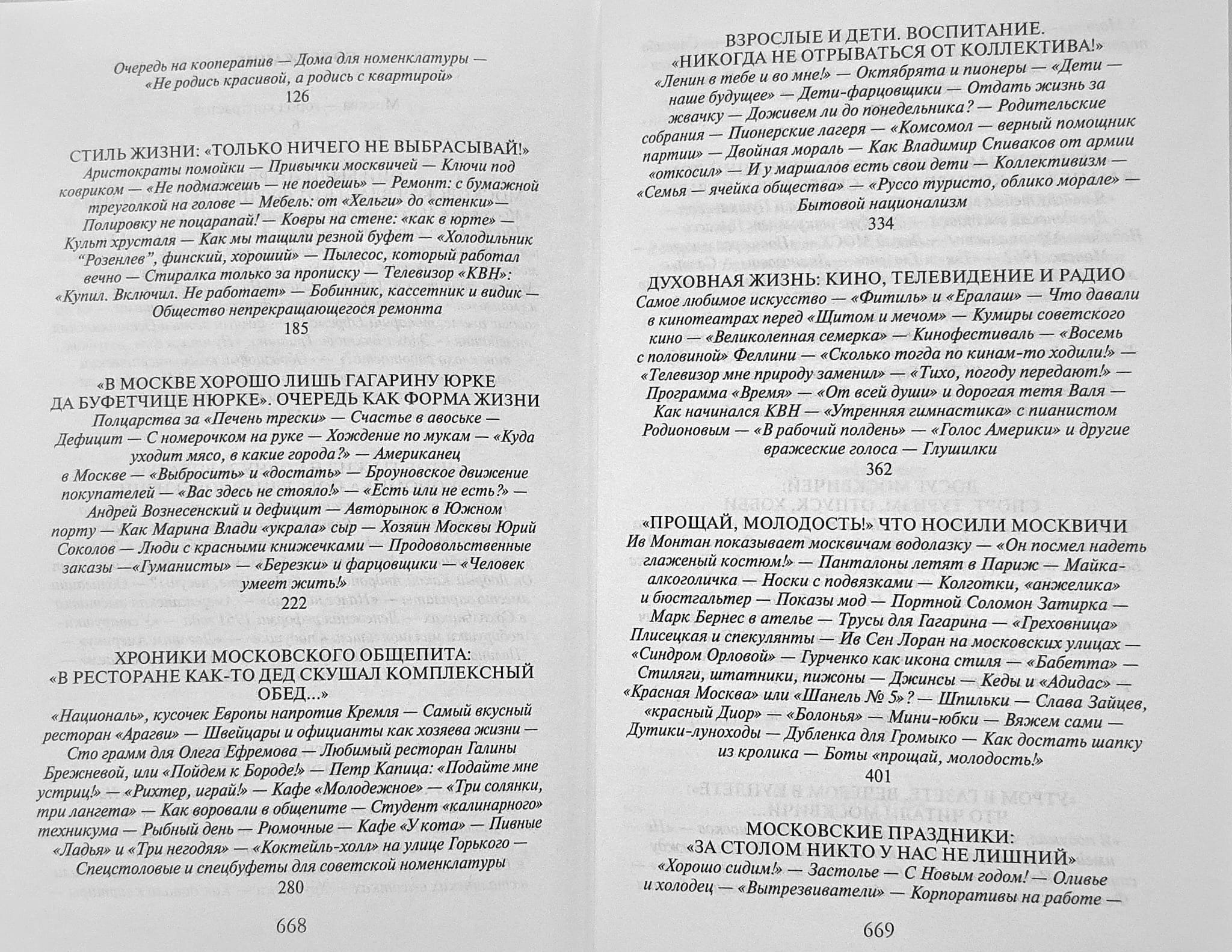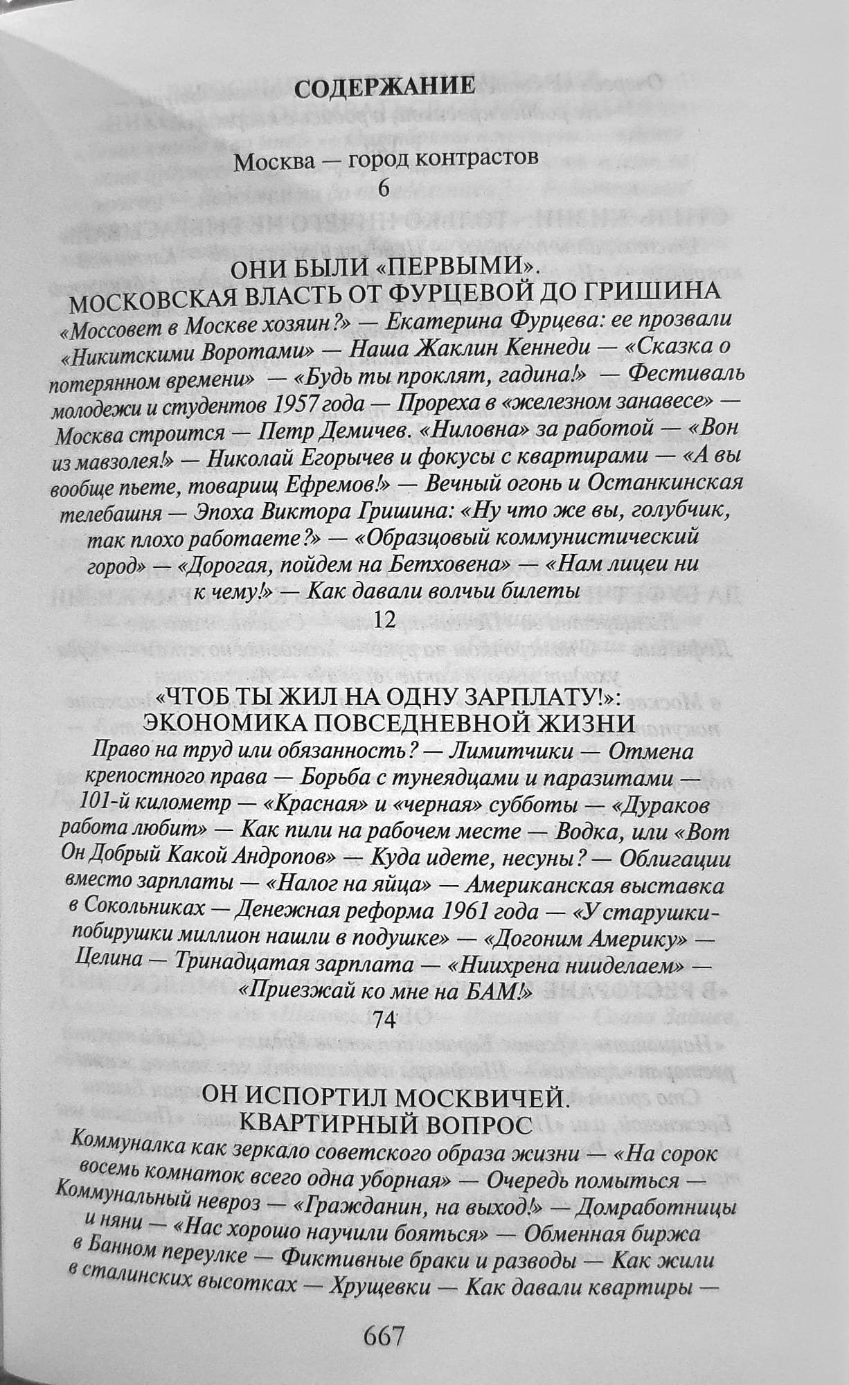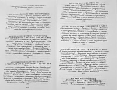 Читатели узнают о том, как москвичи в те годы работали и отдыхали, на что тратили получку и на чем экономили, как выживали в коммуналках и стояли в очередях за продуктами (цены прилагаются), какие театры и художественные выставки посещали и как доставали джинсы и сапоги, где в Москве были Маяк и Пушка и кого прозвали «Никитскими Воротами». А еще читатели научатся распознавать речь той эпохи благодаря словарику московского быта, любезно составленному автором - известным историком и писателем Александром Васькиным.