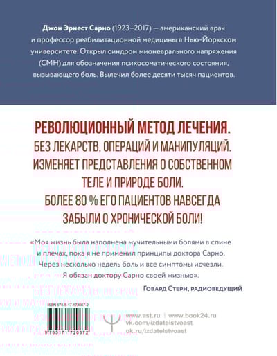 Сарно доказывает, что боль, особенно в шее, спине, конечностях и мигрень, часто возникает из-за подавленных эмоций — гнева, обиды и тревоги. Во многих случаях невозможно вылечить тело, не обращая вынимания на психику.