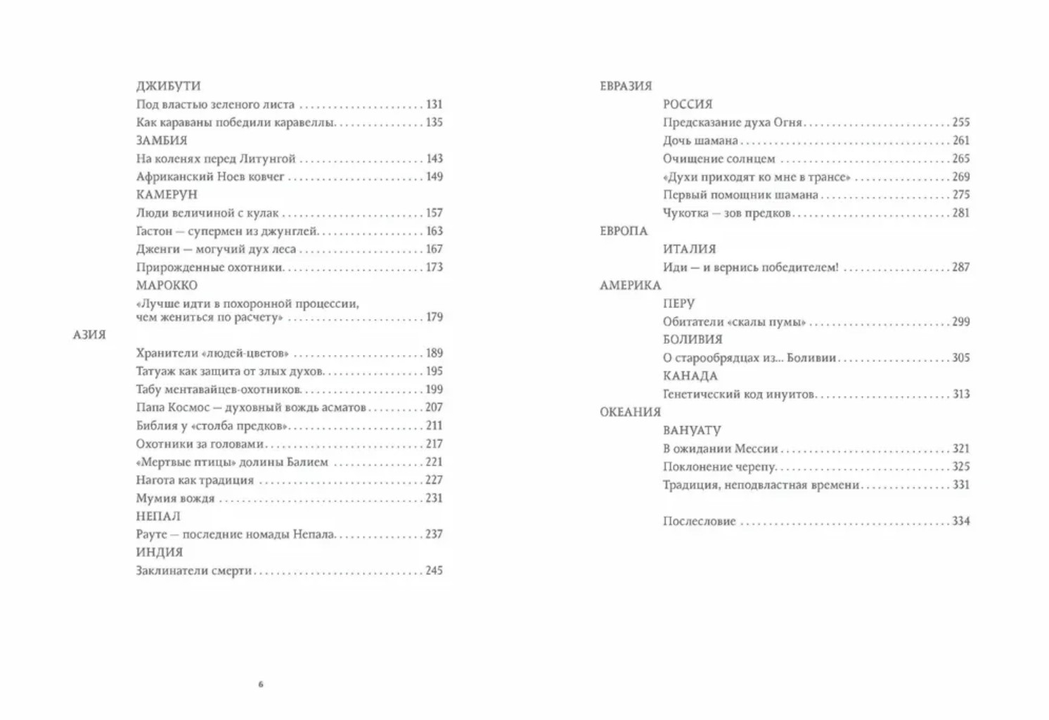 В очерках описаны практики аборигенных народов от Африки до Океании: конная охота бушменов в Калахари, охота на обезьян племени Рауте в Непале, обряд захоронения черепа вождя на Вануату и многое другое.