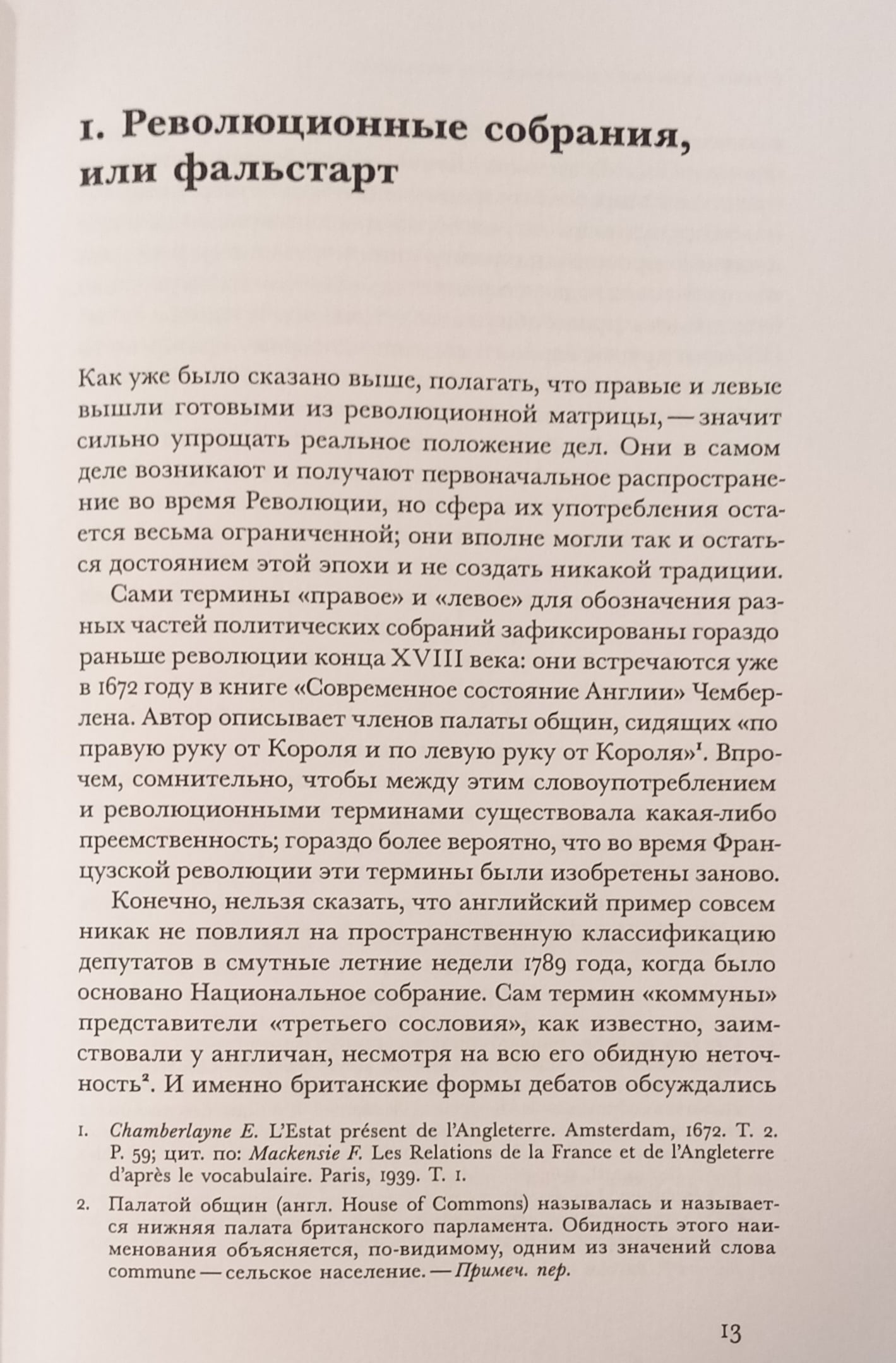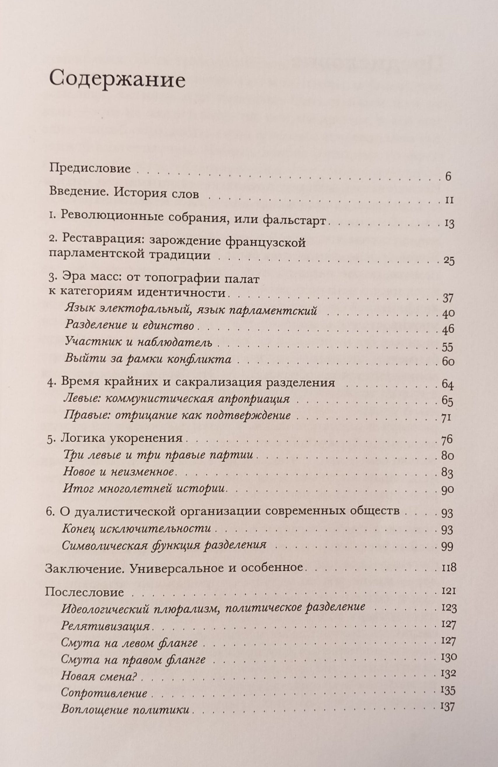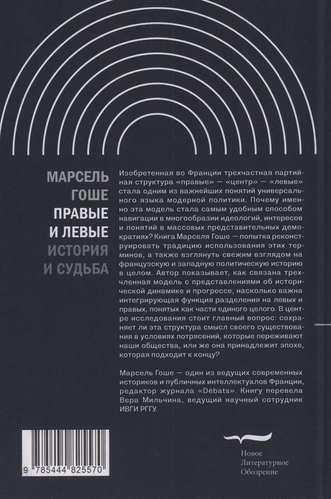 Книга Марселя Гоше — попытка реконструировать традицию использования этих терминов, а также взглянуть свежим взглядом на французскую и западную политическую историю в целом. Автор показывает, как связана трехчленная модель с представлениями об исторической динамике и прогрессе, насколько важна интегрирующая функция разделения на левых и правых, понятых как части единого целого. В центре исследования стоит главный вопрос: сохраняет ли эта структура смысл своего существования в условиях потрясений, которые переживают наши общества, или же она принадлежит эпохе, которая подходит к концу?