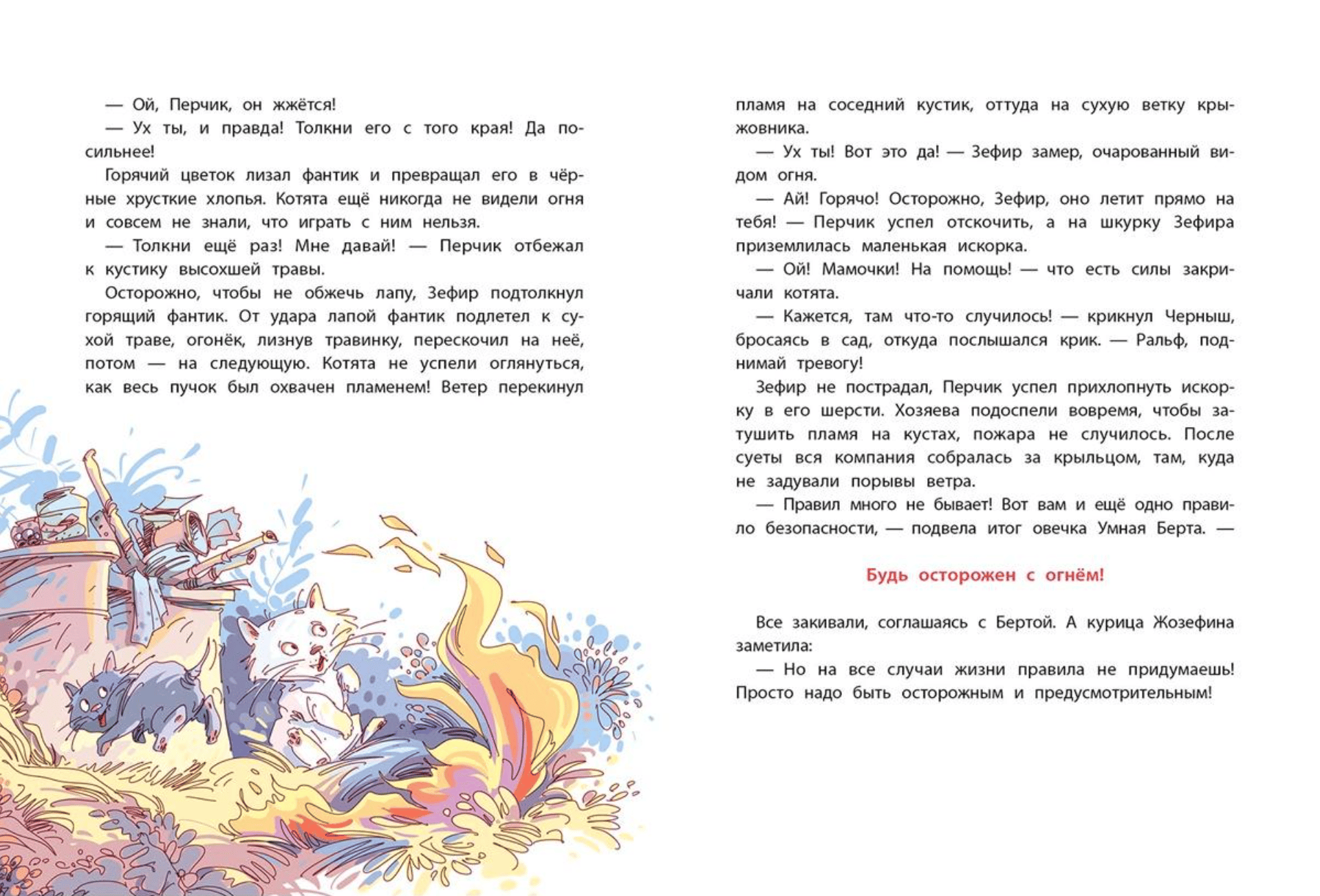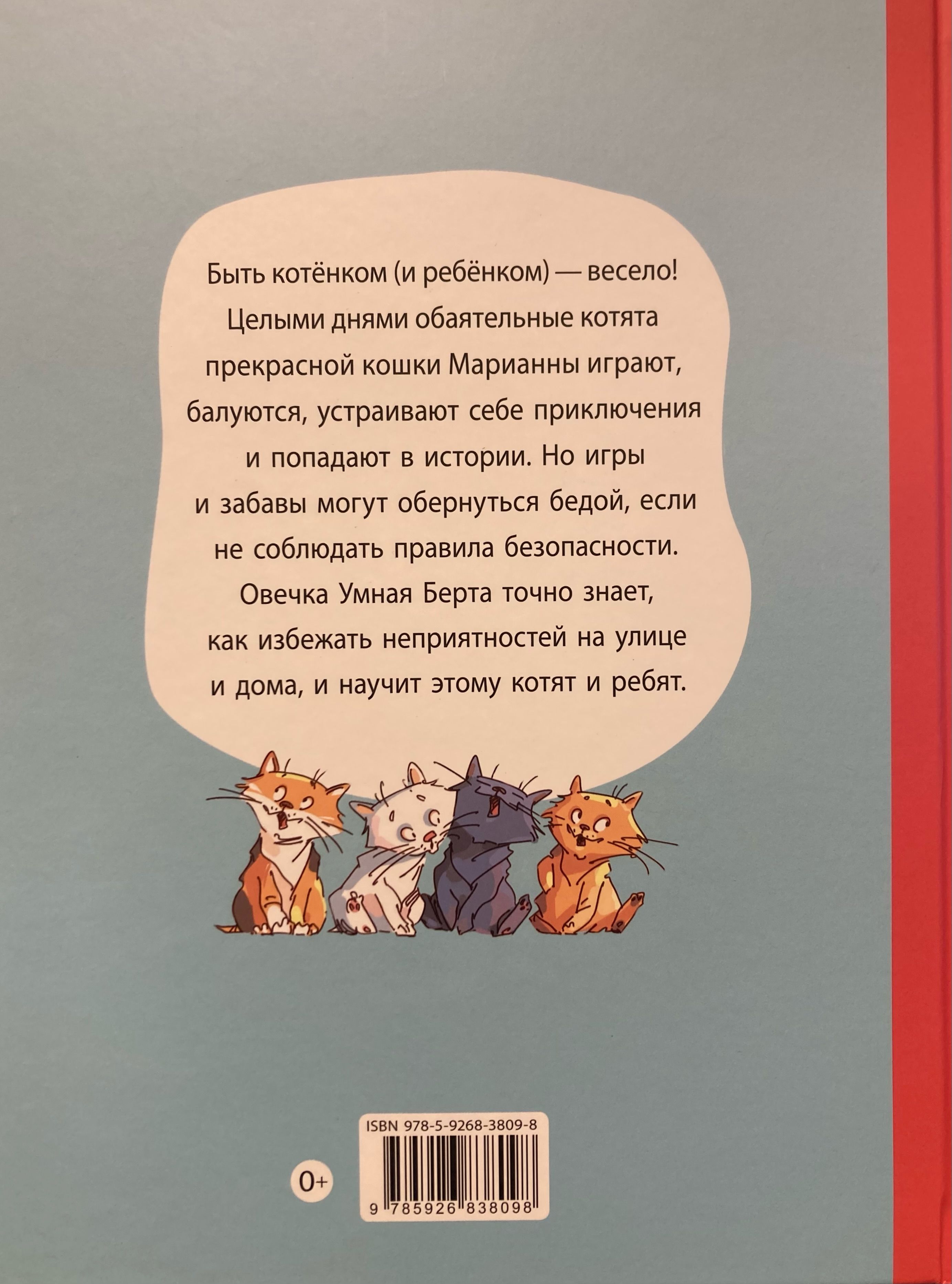 Котята прекрасной кошки Марианны постоянно попадают в истории, которые могли бы обернуться бедой, если бы не помощь обитателей большого двора: быстрого кота Черныша, умной овечки Берты, отважного шпица Апельсина и надежного дворового пса Ральфа. Ребятам (и котятам) будет полезно узнать, почему нельзя играть на балконе, уходить с незнакомыми людьми или открывать дверь чужакам. Но никакого назидательного тона! Захватывающие приключения обаятельных котят станут интересным чтением, и правила безопасности запомнятся сами собой. Книга научит ребят 5–7 лет безопасному поведению в доме и на улице. В динамичных рисунках иллюстратора Леонида Гамарца котята веселятся, переживают и учатся новому вместе с читателями.