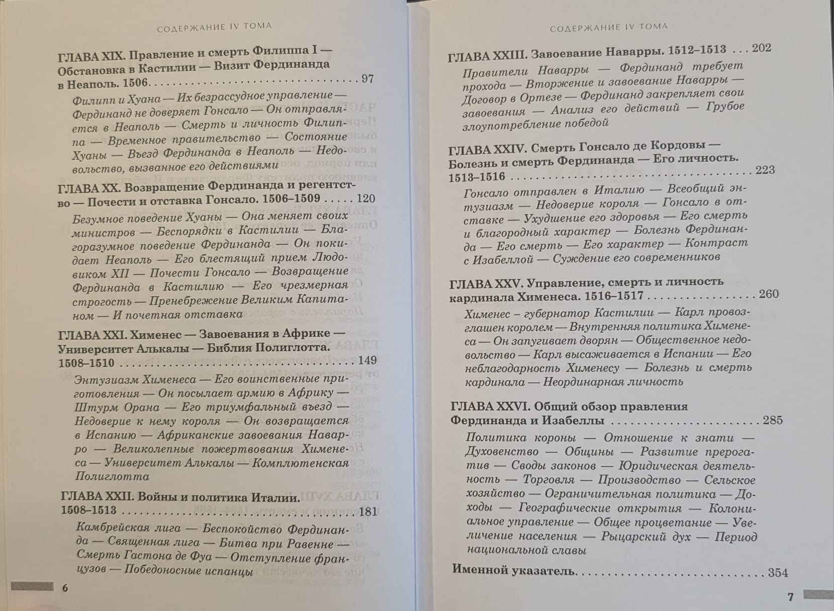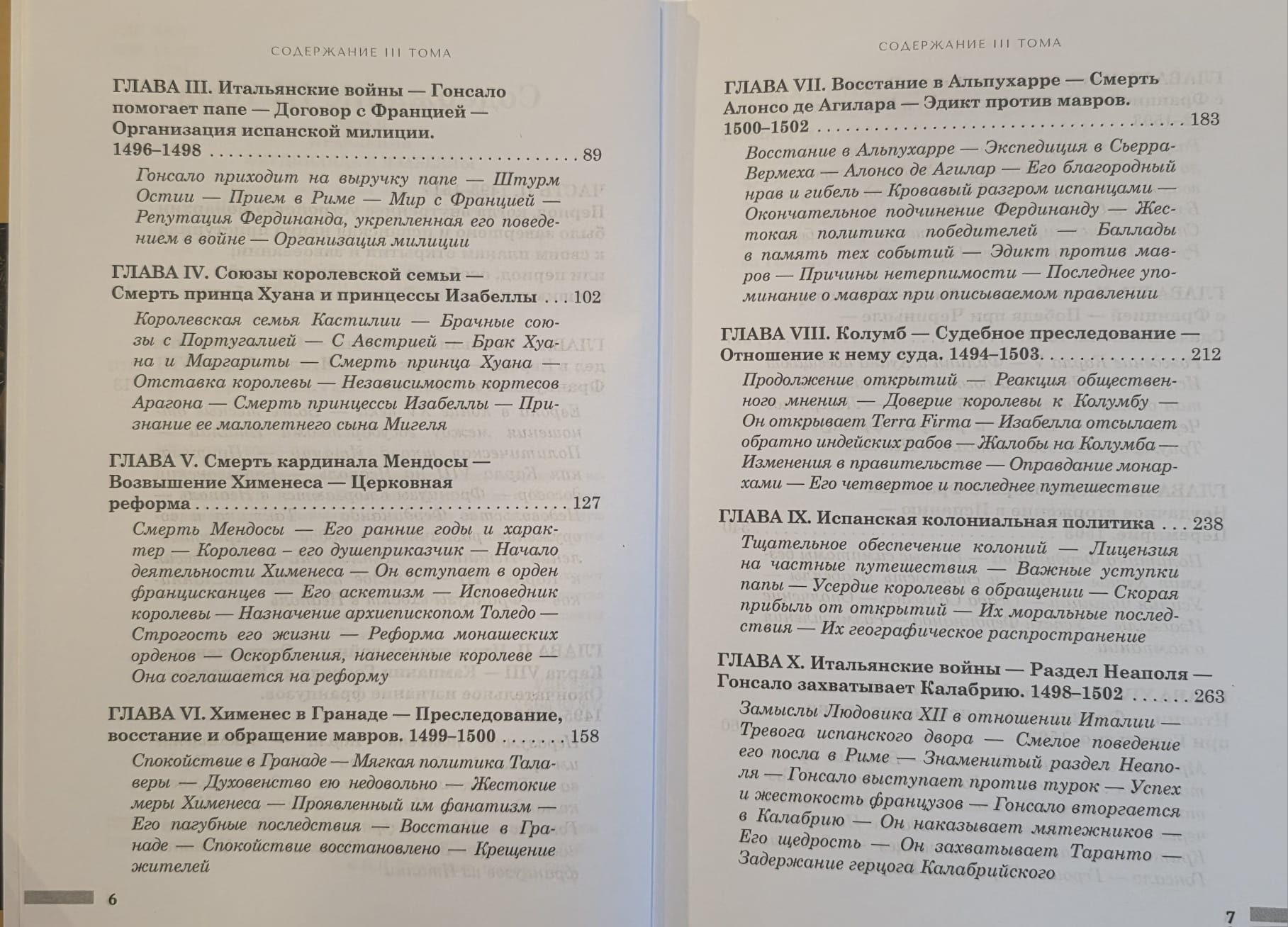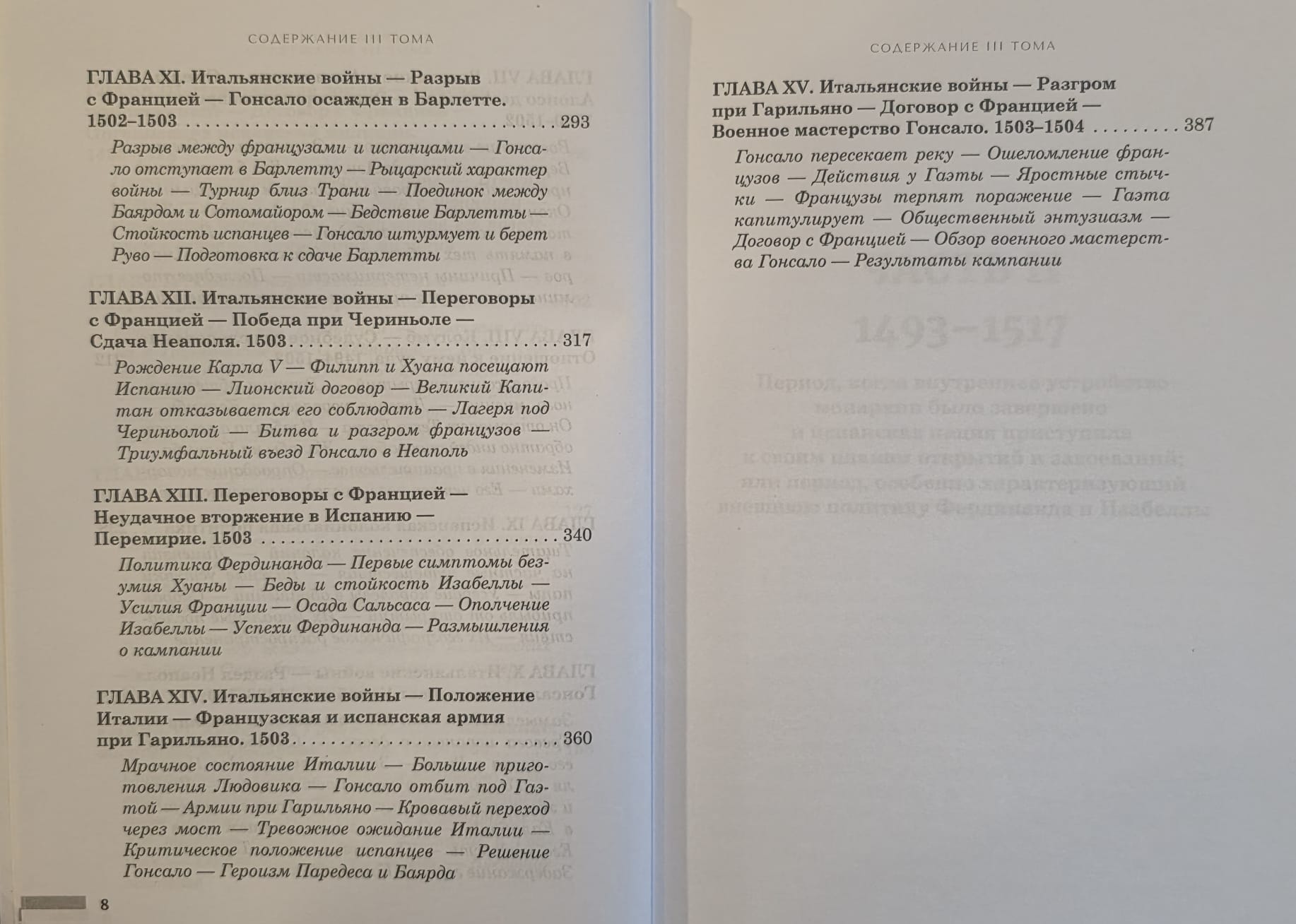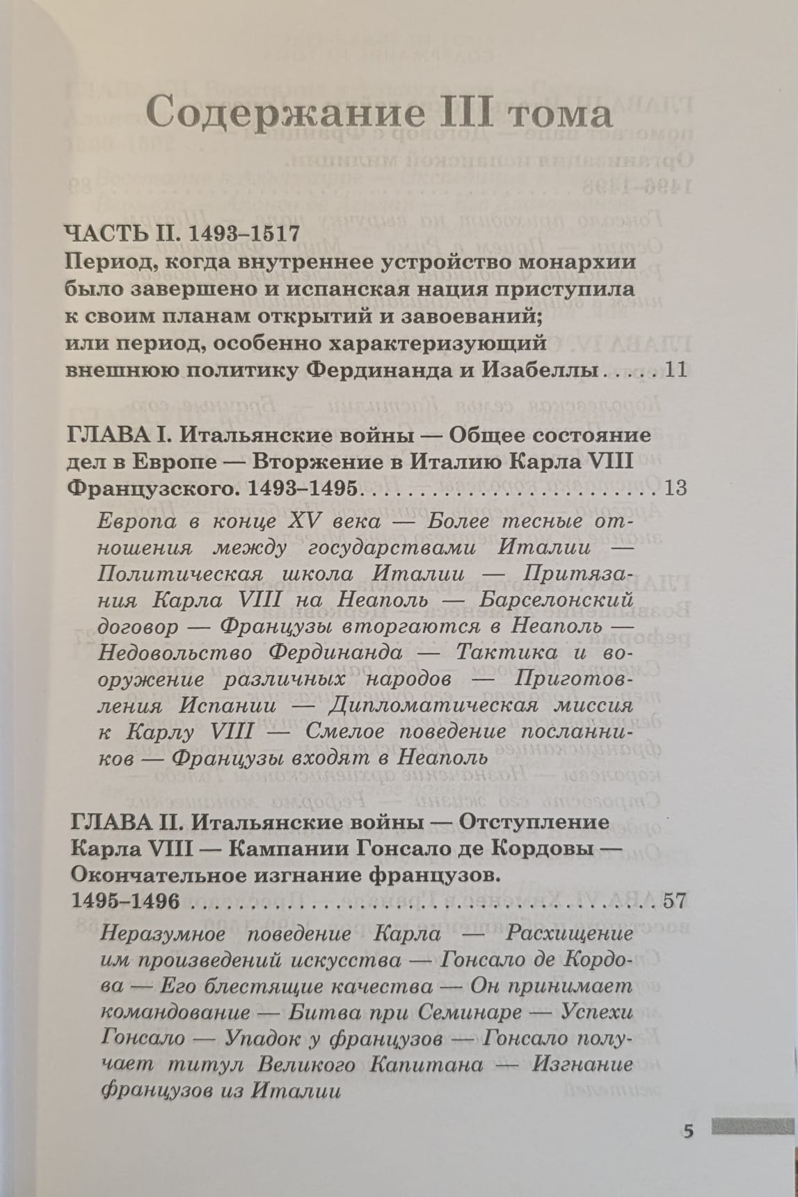 В первом томе второй части охватываются события с 1493 по 1504 годы и включает в себя историю Итальянских войн, обращение в христианство и высылку мавров из Испании, а также рассматривает аспекты колонизации территорий Нового Света.