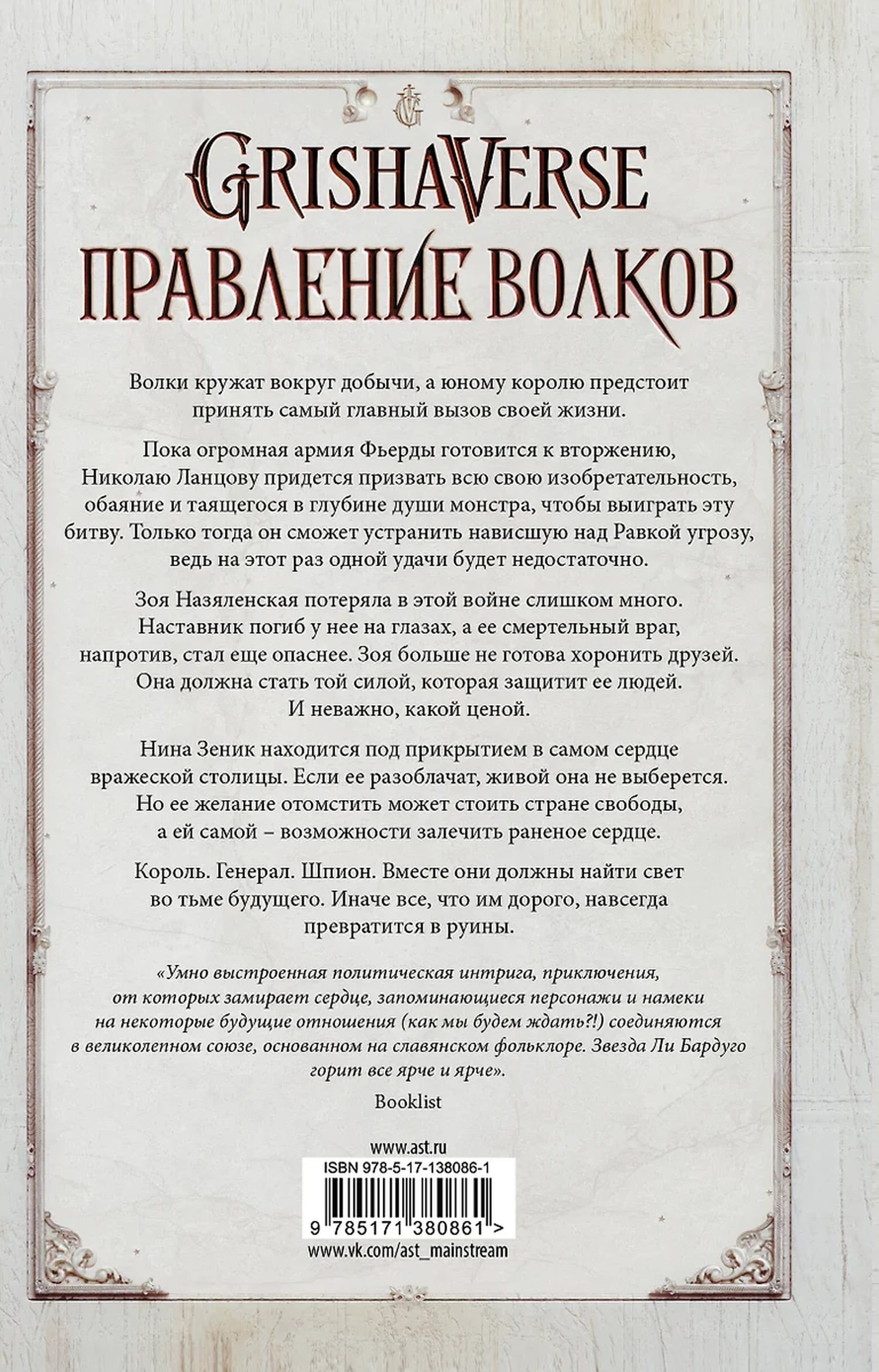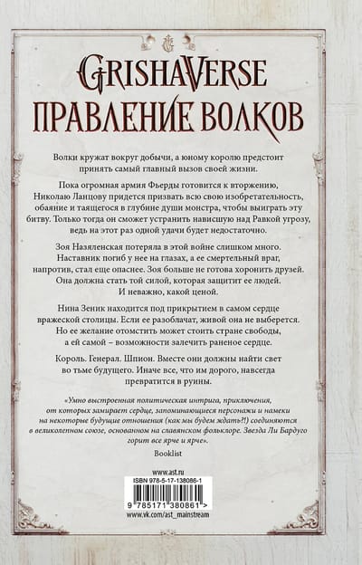 Во лжи кружат вокруг добычи, а юному королю предстоит принять самый главный вызов своей жизни. Пока огромная армия Фьерды готовится к вторжению, Николаю Ланцову придется призвать всю свою изобретательность, обаяние и таящегося в глубине души монстра, чтобы выиграть эту битву. Только тогда он сможет устранить нависшую над Равкой угрозу, ведь на этот раз одной удачи будет недостаточно. Зоя Назяленская потеряла в этой войне слишком много. Наставник погиб у нее на глазах, а ее смертельный враг, напротив, стал еще опаснее. Зоя больше не готова хоронить друзей. Она должна стать той силой, которая защитит ее людей. И неважно, какой ценой. Нина Зеник находится под прикрытием в самом сердце вражеской столицы. Если ее разоблачат, живой она не выберется. Но ее желание отомстить может стоить стране свободы, а ей самой - возможности залечить раненое сердце. Король. Генерал. Шпион. Вместе они должны найти свет во тьме будущего. Иначе все, что им дорого, навсегда превратится в руины.