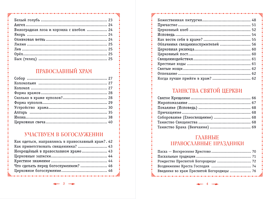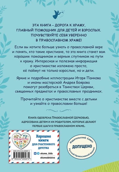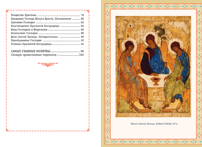 В конце издания есть краткий словарь церковных терминов, а также самые главные молитвы. Несомненная ценность издания — яркие цветные иллюстрации замечательного детского художника Игоря Панкова, они объясняют многие детали церковной жизни. Также на страницах азбуки вы увидите самые главные иконы русского православия, написанные в мастерской Андрея Боярова.