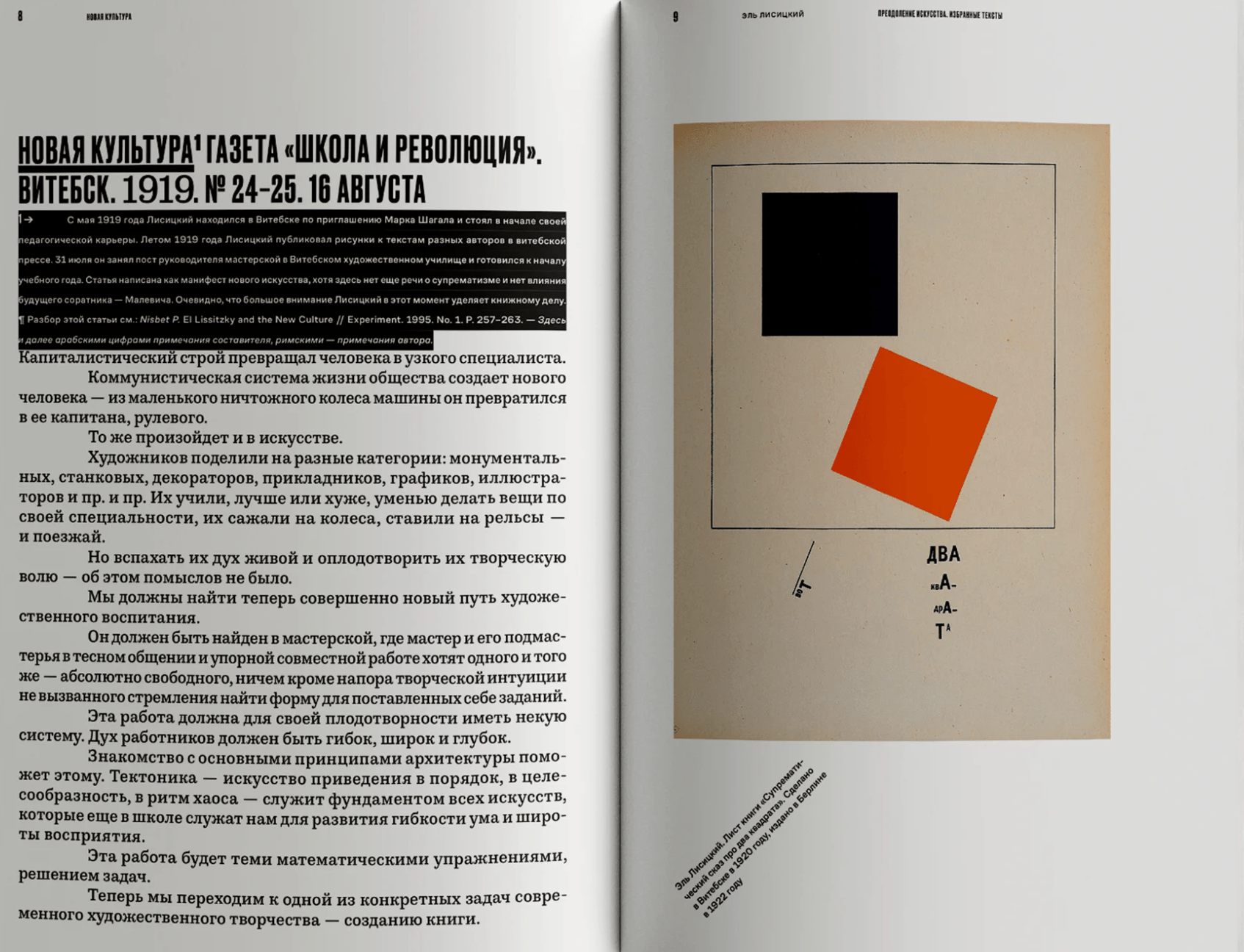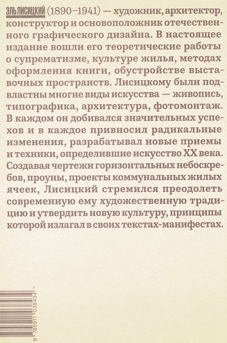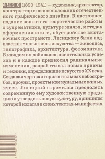 Эль Лисицкий (1890–1941) — художник, архитектор, конструктор и основоположник отечественного графического дизайна. В настоящее издание вошли его теоретические работы о супрематизме, культуре жилья, методах оформления книги, обустройстве выставочных пространств. Лисицкому были подвластны многие виды искусства — живопись, типографика, архитектура, фотомонтаж. В каждом он добивался значительных успехов и в каждое привносил радикальные изменения, разрабатывал новые приемы и техники, определившие искусство XX века. Создавая чертежи горизонтальных небоскребов, проуны, проекты коммунальных жилых ячеек, Лисицкий стремился преодолеть современную ему художественную традицию и утвердить новую культуру, принципы которой излагал в своих текстах-манифестах.