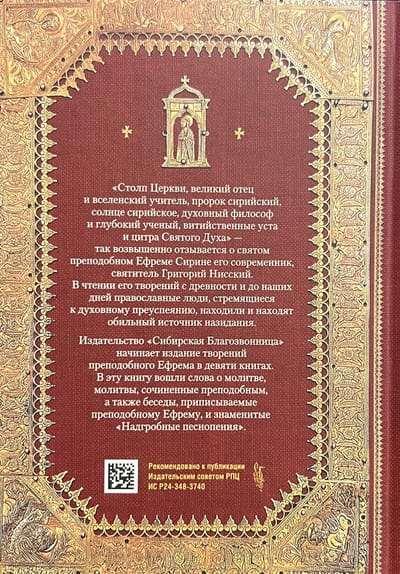 «Столп Церкви, великий отец и вселенский учитель, пророк сирийский, солнце сирийское, духовный философ и глубокий ученый, витийственные уста и цитра Святого Духа» — так возвышенно отзывается о святом преподобном Ефреме Сирине его современник, святитель Григорий Нисский. В чтении его творений с древности и до наших дней православные люди, стремящиеся к духовному преуспеянию, находили и находят обильный источник назидания. Издательство «Сибирская Благозвонница» начинает издание творений преподобного Ефрема. В данную книгу вошли слова о молитве, молитвы, сочиненные преподобным, а также беседы, приписываемые преподобному Ефрему, и знаменитые «Надгробные песнопения».