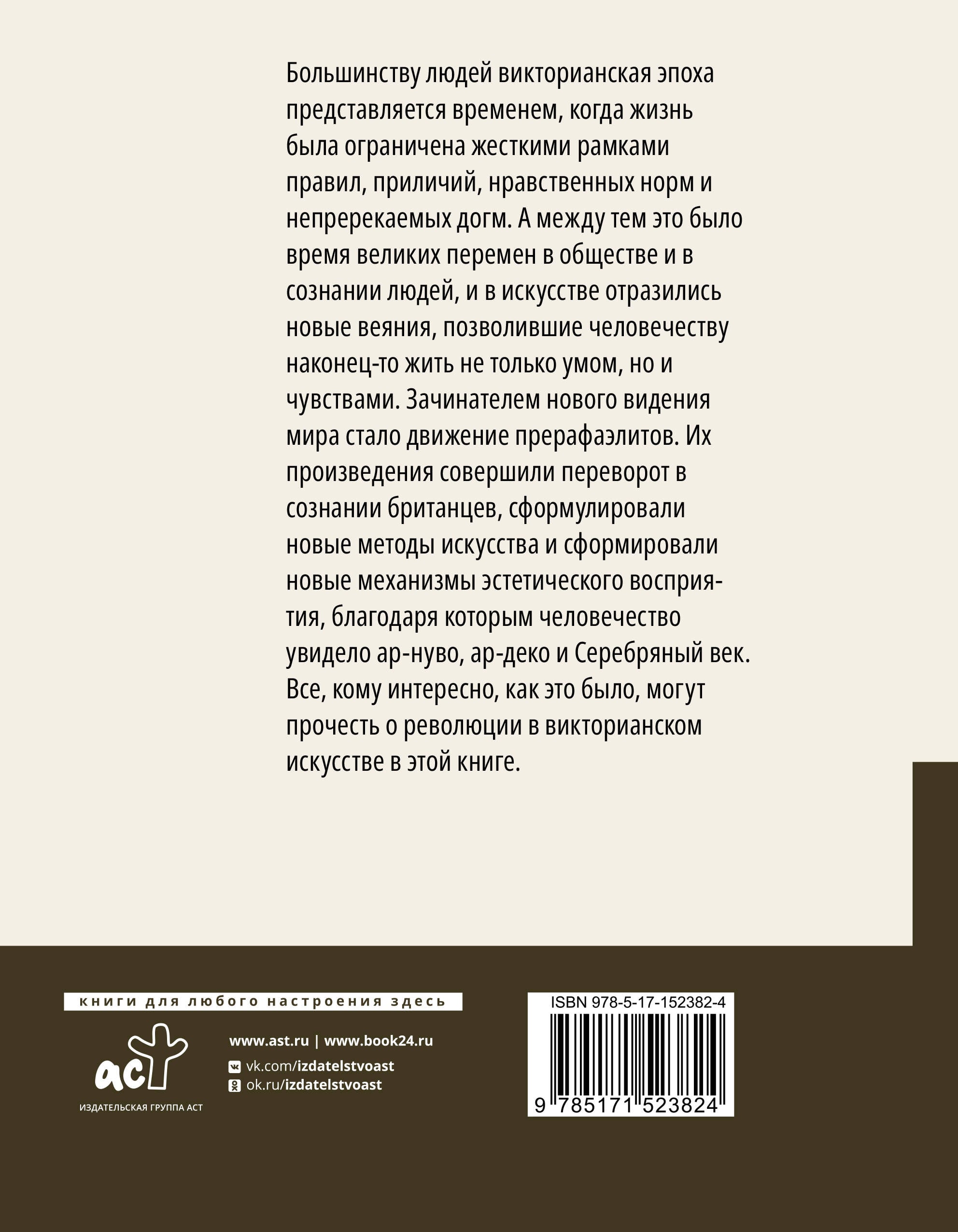 Большинству людей Викторианская эпоха представляется временем, когда жизнь была ограничена жесткими рамками правил, приличий, нравственных норм и непререкаемых догм. А между тем это было время великих перемен в обществе и в сознании людей, и в искусстве отразились новые веяния, позволившие человечеству наконец-то жить не только умом, но и чувствами. Зачинателем нового видения мира стало движение прерафаэлитов. Их произведения совершили переворот в сознании британцев, сформулировали новые методы искусства и сформировали новые механизмы эстетического восприятия, благодаря которым человечество увидело Ар-нуво, Ар-деко и Серебряный век. Все, кому интересно, как это было, могут прочесть о революции в викторианском искусстве в этой книге.