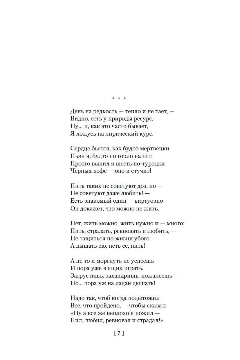 Сегодня, когда остались позади прижизненные полузапреты, отшумели скороспелые посмертные восхваления и наступил период культурной канонизации Владимира Высоцкого как всенародного барда и столь же всенародно любимого актера, стала очевидной уникальность его феномена, который и спустя десятилетия не поддается «присвоению», превращению в «крепко сбитый литой монумент», а продолжает существовать обособленно, следовать «своей колеей» – «без страховки», «назло канатам, тросам, проводам», за линией «красных флажков». Эта обособленность, отдельность, несводимость к расхожим формулам и проторенным тропам (которая и делает автора по-настоящему живым), как ни парадоксально, сочетается с его необыкновенной восприимчивостью к другим творческим голосам, к образному строю высокой поэзии и прозаизмам обыденной речи, с открытостью всевозможным стилям и жанрам, темам и настроениям, стихотворным размерам и лирическим амплуа. Обостренное – до оголения нервов – чувство жизненной и поэтической правды, абсолютный слух, отвергающий любую фальшивую интонацию, неимоверное разнообразие ролей, не сыгранных на сцене и в кино, но прожитых в песнях и стихах, – всю эту полифонию смыслов и образов вместили страницы настоящей книги. В настоящем издании представлен обширный свод поэтических произведений, созданных Владимиром Высоцким с конца 1950-х по 1980 год, а также избранная проза поэта.