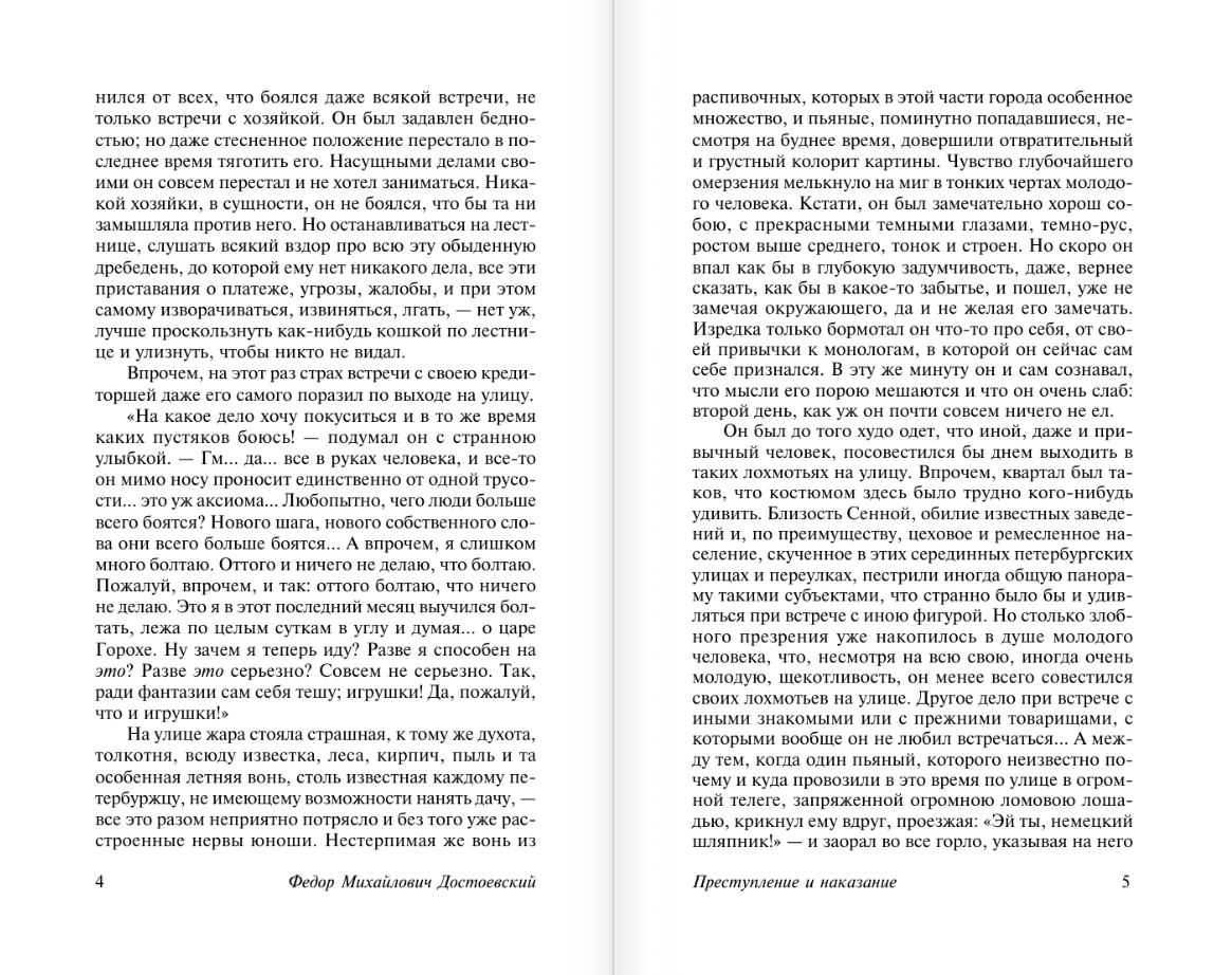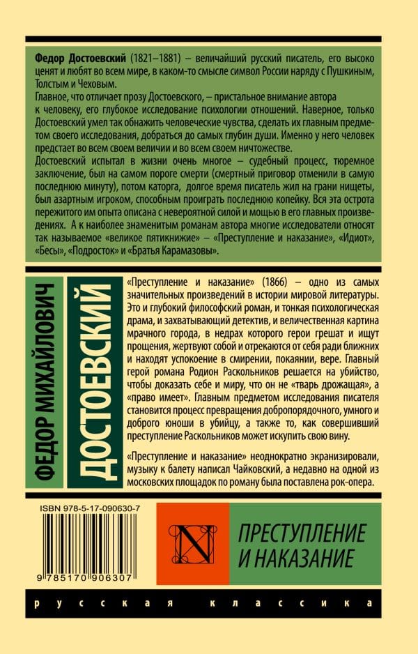 «Преступление и наказание» (1866) — одно из самых значительных произведений в истории мировой литературы. Это и глубокий философский роман, и тонкая психологическая драма, и захватывающий детектив, и величественная картина мрачного города, в недрах которого герои грешат и ищут прощения, жертвуют собой и отрекаются от себя ради ближних и находят успокоение в смирении, покаянии, вере. Главный герой романа Родион Раскольников решается на убийство, чтобы доказать себе и миру, что он не «тварь дрожащая», а «право имеет». Главным предметом исследования писателя становится процесс превращения добропорядочного, умного и доброго юноши в убийцу, а также то, как совершивший преступление Раскольников может искупить свою вину. «Преступление и наказание» неоднократно экранизировали, музыку к балету написал Чайковский, а недавно на одной из московских площадок по роману была поставлена рок-опера.