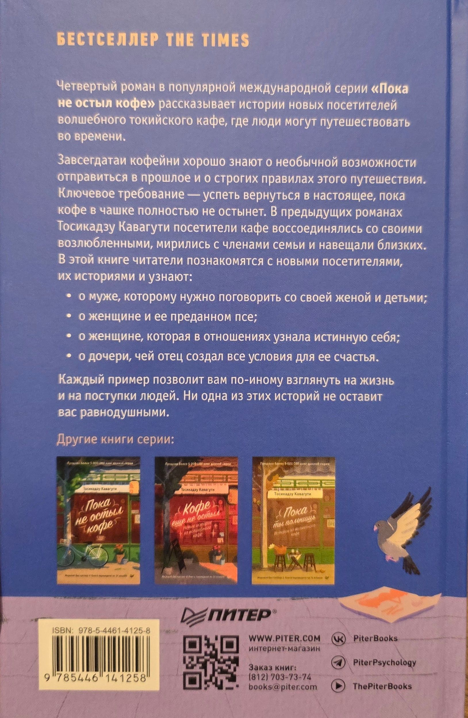 Четвёртый роман в популярной международной серии «Пока не остыл кофе» рассказывает истории новых посетителей волшебного токийского кафе, где люди могут путешествовать во времени. Завсегдатаи кофейни хорошо знают о необычной возможности отправиться в прошлое и о строгих правилах этого путешествия. Ключевое требование – успеть вернуться в настоящее, пока кофе в чашке полностью не остынет. В предыдущих романах Тосикадзу Кавагути посетители кафе воссоединялись со своими возлюбленными, мирились с членами семьи и навещали близких. В этой книге читатели познакомятся с новыми посетителями, их историями и узнают о: