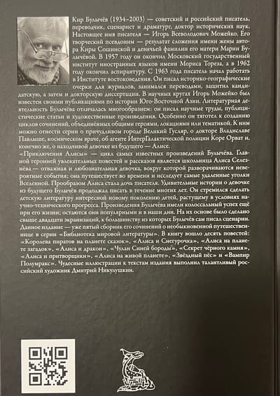 Кир Булычёв (1934–2003) — советский и российский писатель, переводчик, сценарист и драматург, доктор исторических наук. Настоящее имя писателя — Игорь Всеволодович Можейко. Его творческий псевдоним — результат сложения имени жены автора Киры Сошинской и девичьей фамилии его матери Марии Булычёвой. В 1957 году он окончил Московский государственный институт иностранных языков имени Мориса Тореза, а в 1962 году окончил аспирантуру. С 1963 года писатель начал работать в Институте востоковедения. Он писал историко-географические очерки для журналов, занимался переводами, защитил кандидатскую, а затем и докторскую диссертации. В научных кругах Игорь Можейко был известен своими публикациями по истории Юго-Восточной Азии. Литературная деятельность Булычёва отличалась многообразием: он писал научные труды, публицистические статьи и художественные произведения. Особенно он тяготел к созданию циклов сочинений, объединённых общими героями, локациями или тематикой. К ним можно отнести серии о причудливом городе Великий Гусляр, о докторе Владиславе Павлыше, космическом враче, об агенте ИнтерГалактической полиции Коре Орват и, конечно же, о находчивой девочке из будущего — Алисе.