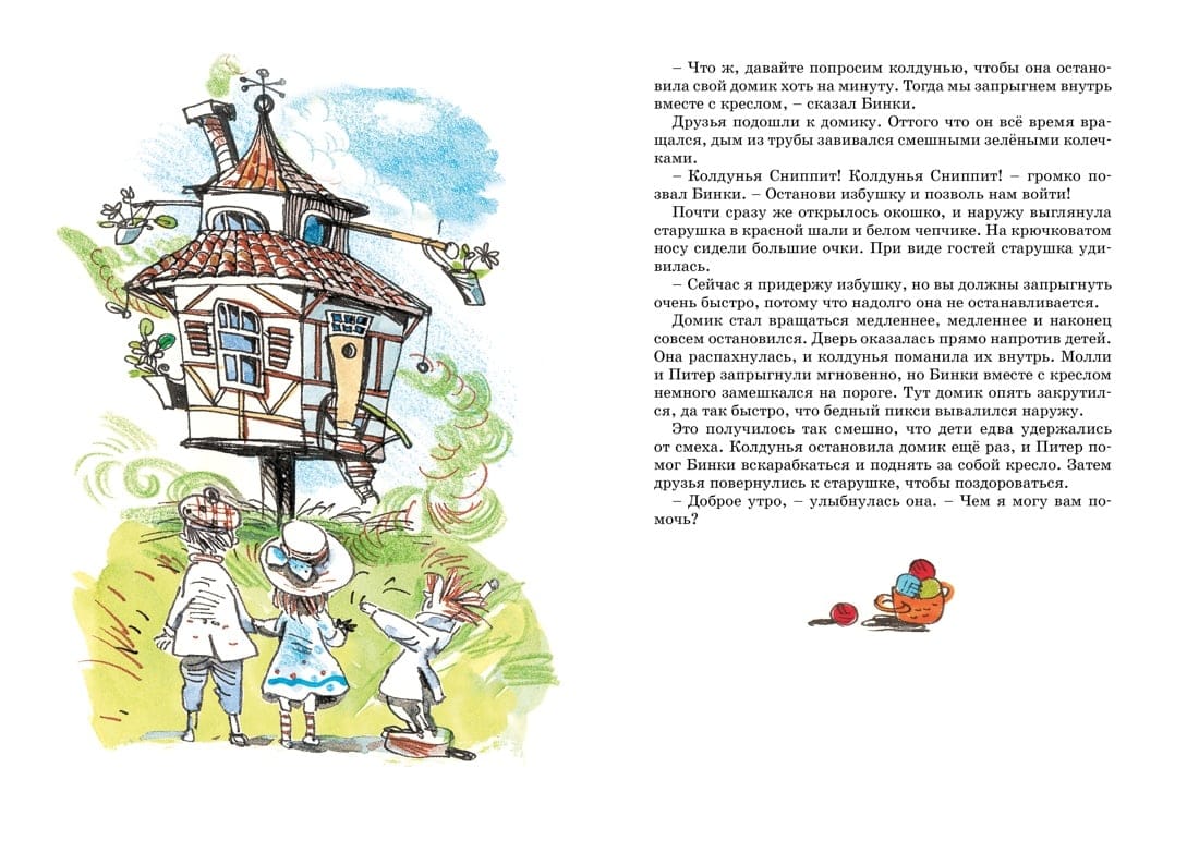 У Молли и Питера – главных героев книги – появилась тайна, самая удивительная и чудесная тайна на свете! В их игровой комнате стоит волшебное кресло, которое в любой момент может отрастить крылышки и перенести своих юных хозяев, куда только они пожелают! Дети посетят замок великана и Исчезающий остров, побывают в гостях у волшебника Хо-Хо и у колдуньи Сниппит… Много-много всего интересного и удивительного ждёт их! А путешествовать Молли и Питер будут вместе со своим замечательным другом – смешным и добрым пикси по имени Бинки.