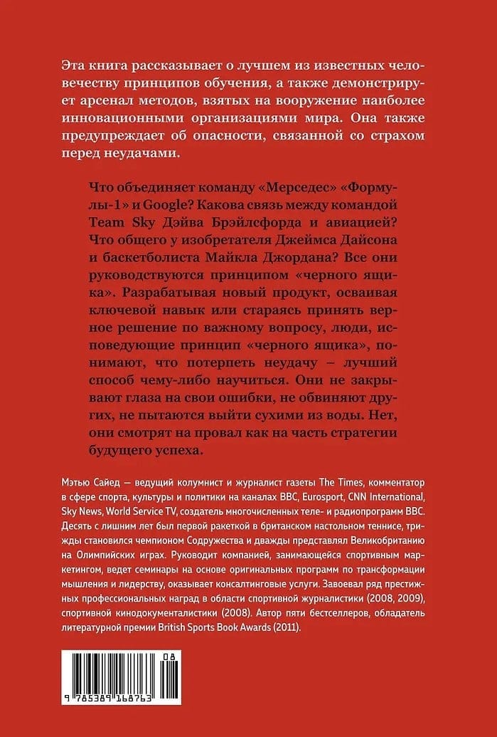В современной культуре принято праздновать достижения и игнорировать провалы. Ошибки воспринимаются либо как фатальное стечение обстоятельств и случайное отклонение от нормы, либо, напротив, они переоцениваются — тогда человек, принявший неверное решение, обвиняется в некомпетентности и клеймится позором. Британский журналист и бизнесмен, в прошлом выдающийся теннисист, участник нескольких Олимпиад Мэтью Сайед на основе своего богатого спортивного, предпринимательского и творческого опыта пришел к выводу: такое отношение к ошибкам отнимает у людей и организаций возможность извлечь пользу из провалов и искоренить причину неудачи. Сайед исследует истоки и последствия ошибок в науке, технике, юриспруденции, спорте, вскрывает психологические механизмы, стоящие за стремлением скрыть неудачи, и показывает путь, которым должен пройти каждый, чтобы изменить свое отношение к ошибкам и положить их в основу будущего успеха. "Рассказывая истории успеха, мы постараемся найти все его составляющие. Мы вскроем и исследуем тайные процессы, которые позволяют учиться, меняться, творить — в бизнесе, в политике, в обычной жизни. Как мы увидим, во всех случаях успех неизменно объясняется — неожиданно и часто не слишком логично — тем, как мы реагируем на неудачу". (Мэтью Сайед)