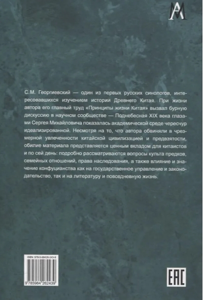 С.М. Георгиевский — один из первых русских синологов, интересовавшихся изучением истории Древнего Китая. При жизни автора его главный труд «Принципы жизни Китая» вызвал бурную дискуссию в научном сообществе — Поднебесная ХХ века глазами Сергея Михайловича показалась академической среде