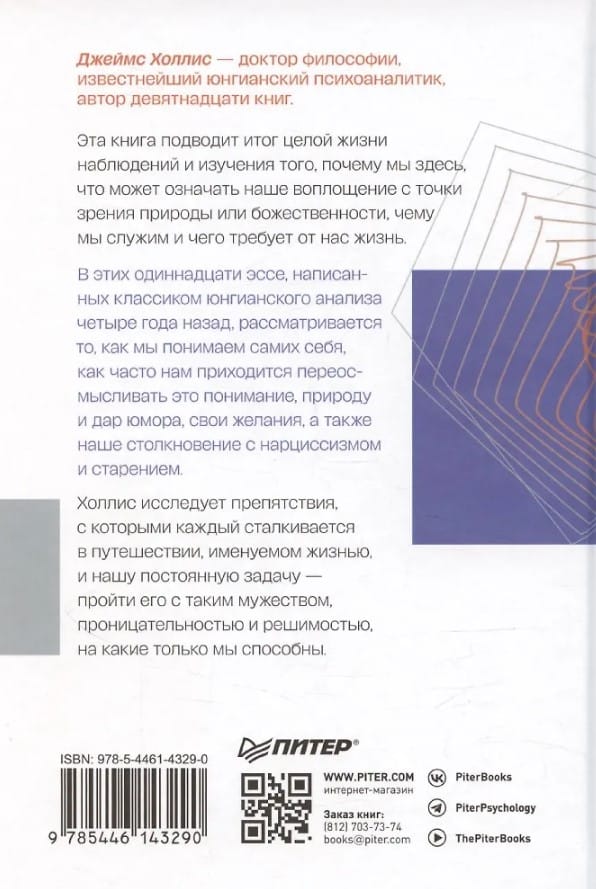 Эта книга подводит итог целой жизни наблюдений и изучения того, почему мы здесь, что может означать наше воплощение с точки зрения природы или божественности, чему служим и чего требует от нас жизнь. В этих одиннадцати эссе, написанных классиком юнгианского анализа четыре года назад, рассматривается то, как мы понимаем самих себя, как часто нам приходится переосмысливать это понимание, природу и дар юмора, воображение, желания, а также наше столкновение с нарциссизмом и старением. Холлис исследует препятствия, с которыми мы сталкиваемся, и нашу постоянную задачу - прожить наше короткое путешествие с таким мужеством, проницательностью и решимостью, на какие только мы способны.