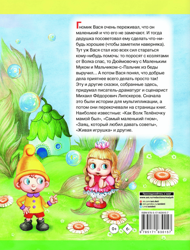 Михаил Фёдорович Липскеров — писатель-драматург и сценарист. Тридцать четыре его сценария стали признанными мультипликационными лентами. Самые популярные — «Как Волк Телёночку мамой был», «Самый маленький гном», «Заяц, который любил давать советы», «Живая игрушка» и другие. Потом эти истории перекочевали на страницы книг и стали сказками. Самые известные из них вошли в эту книгу.