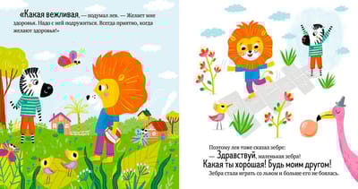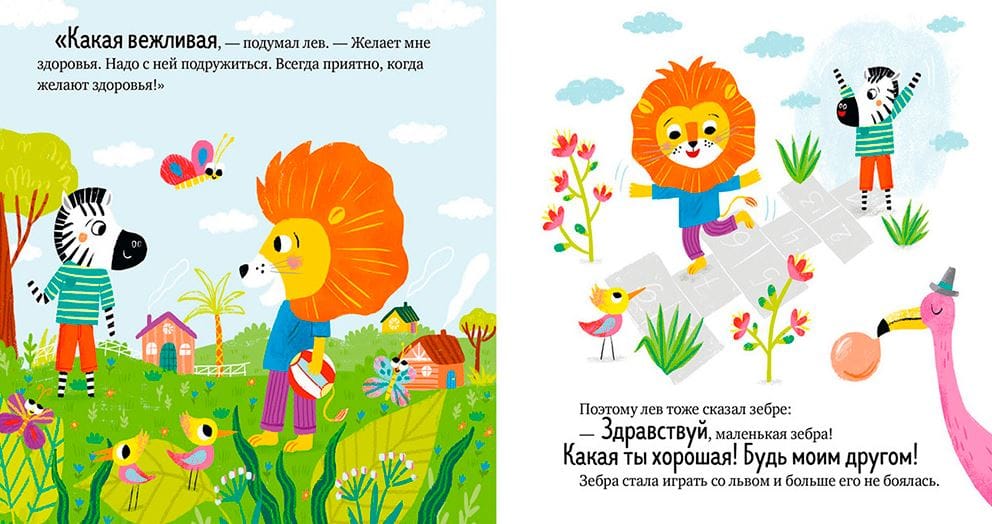 Как зебре удалось подружиться со львом? Мама научила зебру, что нужно поздороваться. «Здравствуйте» — это волшебное слово. Мартышке оно тоже помогло завести друзей. А еще сказки познакомят с такими волшебными словами, как «до свидания», «извините», «спасибо».