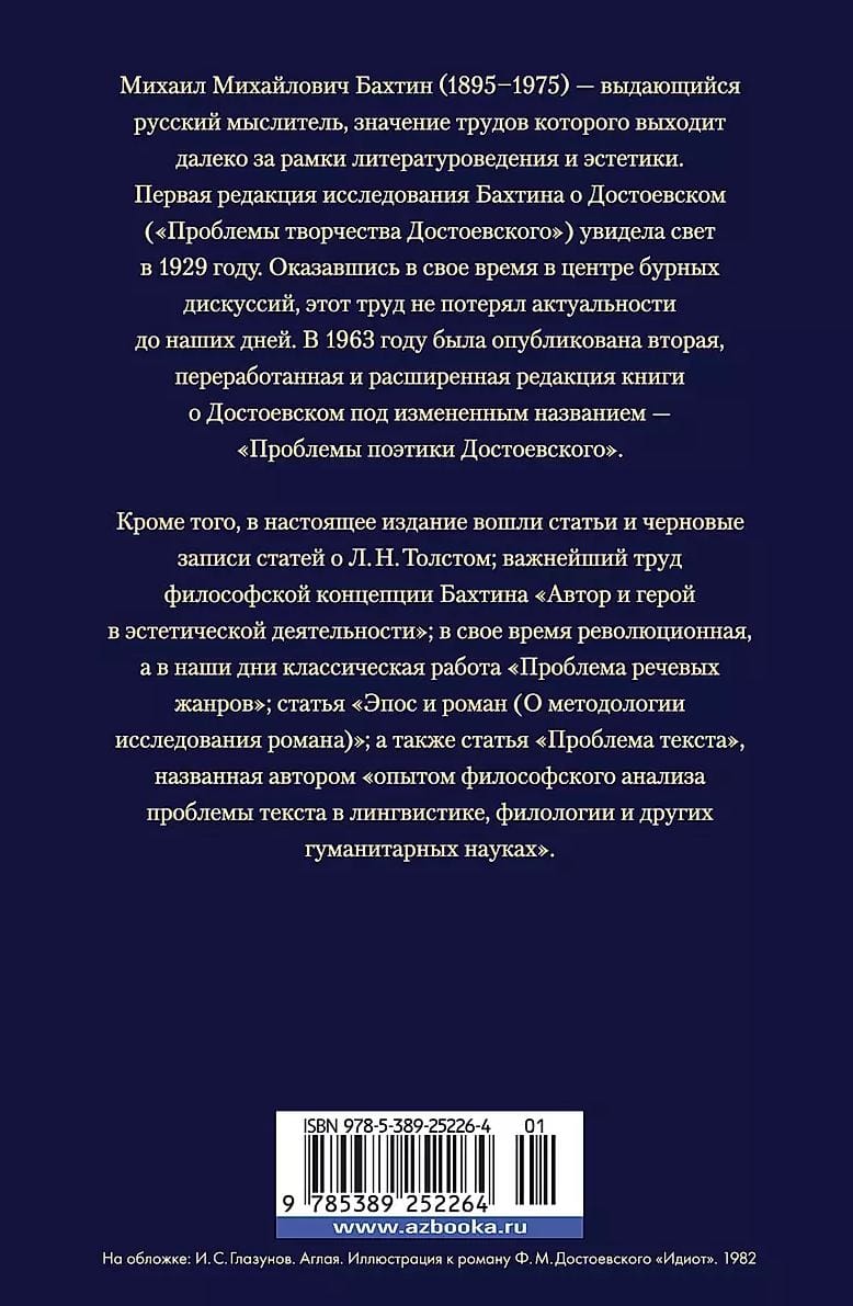 Михаил Михайлович Бахтин (1895–1975) — выдающийся русский мыслитель, значение трудов которого выходит далеко за рамки литературоведения и эстетики. Первая редакция исследования Бахтина о Достоевском («Проблемы творчества Достоевского») увидела свет в 1929 году. Оказавшись в свое время в центре бурных дискуссий, этот труд не потерял актуальности до наших дней. В 1963 году была опубликована вторая, переработанная и расширенная редакция книги о Достоевском под измененным названием — «Проблемы поэтики Достоевского». Кроме того, в настоящее издание вошли статьи и черновые записи статей о Л. Н. Толстом; важнейший труд философской концепции Бахтина «Автор и герой в эстетической деятельности»; в свое время революционная, а в наши дни классическая работа «Проблема речевых жанров»; статья «Эпос и роман (О методологии исследования романа)»; а также статья «Проблема текста», названная автором «опытом философского анализа проблемы текста в лингвистике, филологии и других гуманитарных науках».