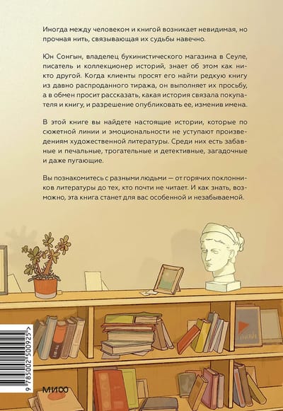 Юн Сонгын, владелец букинистического магазина в Сеуле, писатель и коллекционер историй, знает об этом как никто другой. Когда клиенты просят его найт редкую книгу из давно распроданного тиража, он выполняет их просьбу - а в обмен просит рассказать, какая история связала покупателя и книгу, и разрешение опубликовать её, изменив имена.
