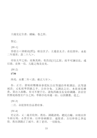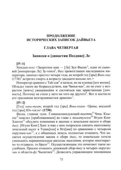 «Полное собрание исторических записок Дайвьета» - центральный памятник традиционной исторической мысли Вьетнама (переведен на русский язык и опубликован в восьми томах в 2002-2022 гг.). Текст этой государственной хроники доведен до 1675 г. Продолжение - новые главы, описывающее события до 1740 г., были напечатаны в XVIII в., однако по императорскому указу в XIX в. ксилографы были изъяты и уничтожены как неприемлемые для правящей династии. Сохранились лишь пространные цитаты или переработанные фрагменты этих глав в неофициальных исторических сочинениях и хрониках. Настоящее издание является опытом реконструкции текста продолжения путем критического отбора из всех сохранившихся вариантов.