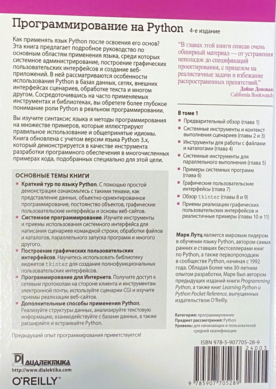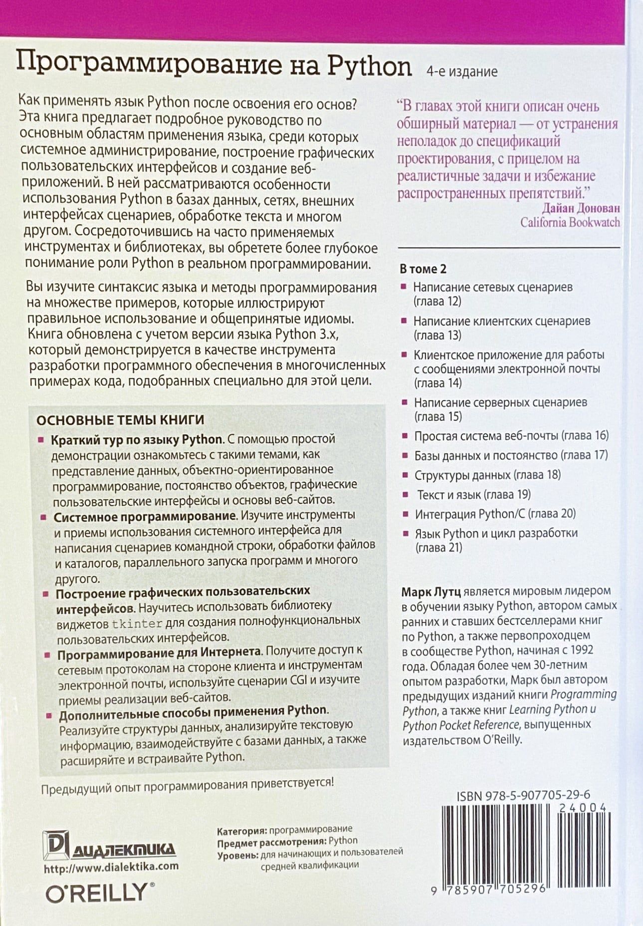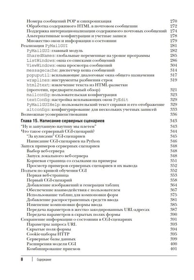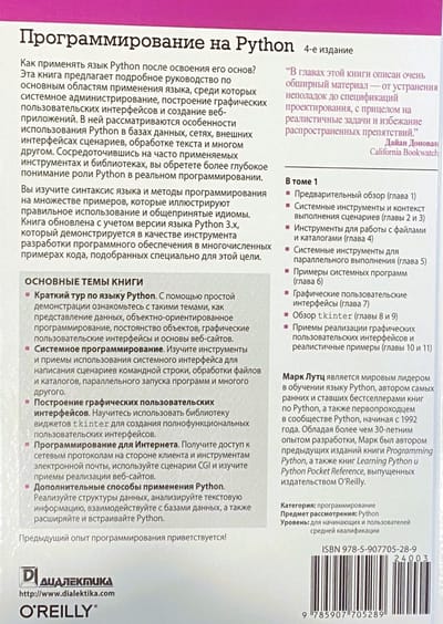 Вы также узнаете, как язык Python используется в базах данных, сетях, внешних интерфейсах сценариев, обработке текста и т.д. Основное внимание в книге уделяется часто применяемым инструментам и библиотекам, которые помогут получить полное представление о многих ролях Python в реальном программировании.