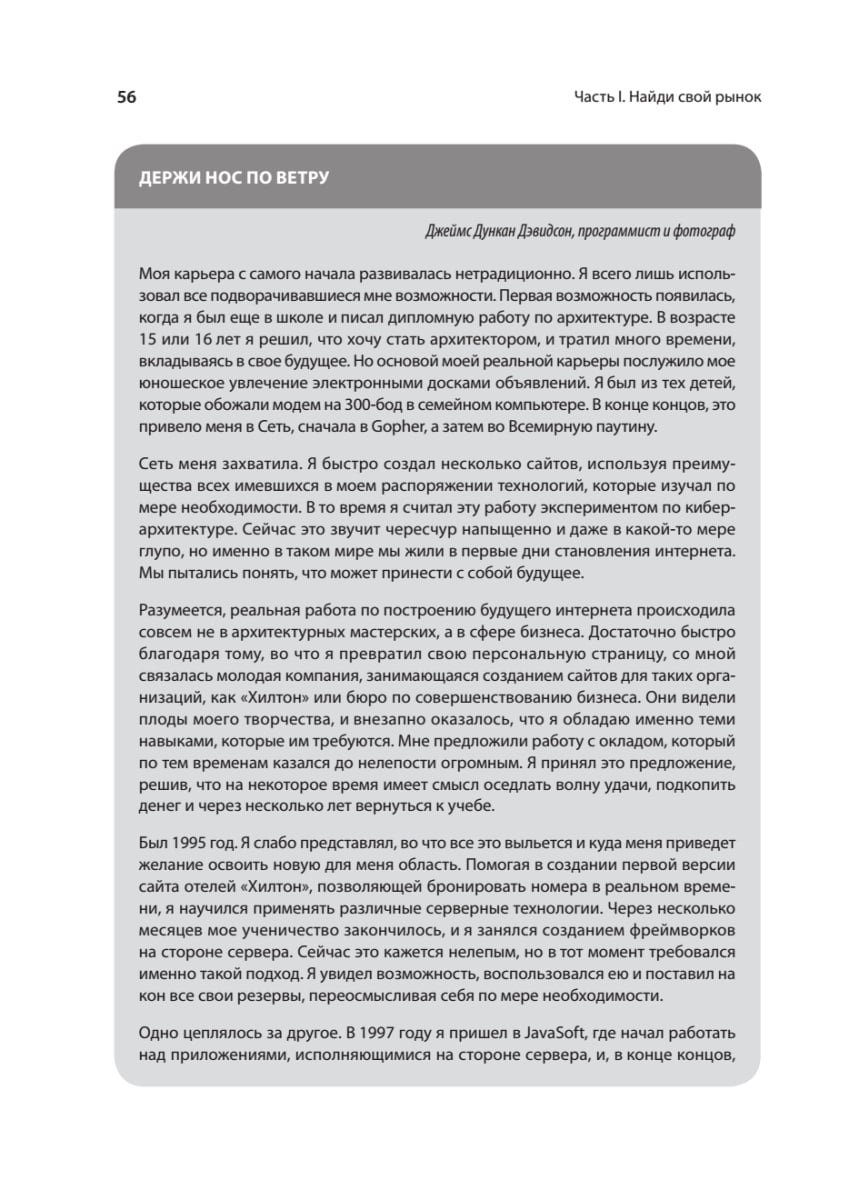В этой книге вы не найдете описания конкретных технологий, алгоритмов и языков программирования – ценность ее не в этом. Она представляет собой сборник практических советов и рекомендаций, касающихся ситуаций, с которыми порой сталкивается любой разработчик: отсутствие мотивации, выбор приоритетов, психология программирования, отношения с руководством и коллегами и многих других. Подобные знания обычно приходят лишь в результате многолетнего опыта реальной работы. По большому счёту перед вами – ярко и увлекательно написанное руководство, которое поможет быстро сделать карьеру в индустрии разработки ПО любому, кто поставил себе такую цель. Конечно, опытные программисты могут найти некоторые идеи автора достаточно очевидными, но и для таких найдутся темы, которые позволят пересмотреть устоявшиеся взгляды и выйти на новый уровень мастерства. Для тех же, кто только в самом начале своего пути как разработчика, чтение данной книги, несомненно, откроет широчайшие перспективы.