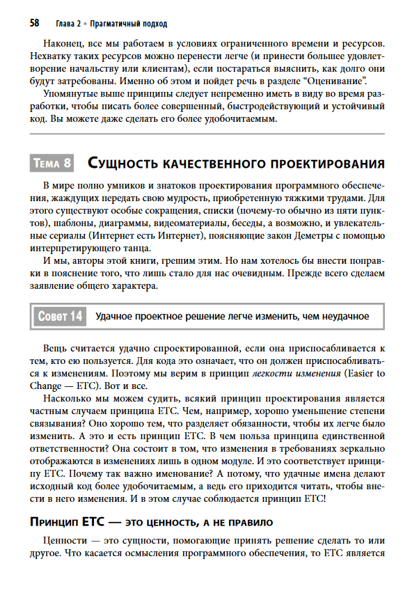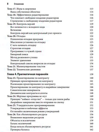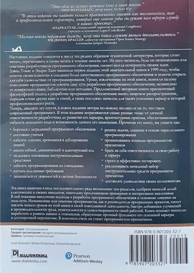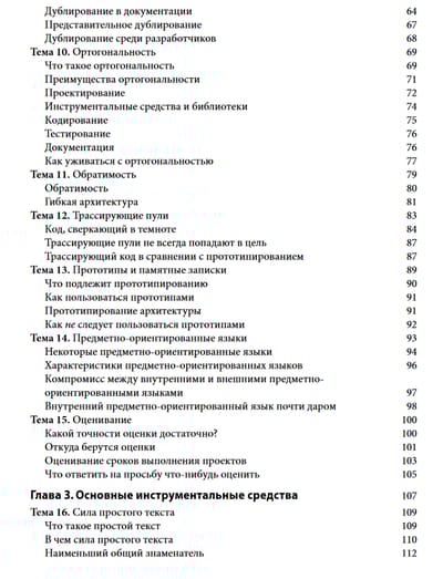 Из него читатель, будь он начинающим или опытным разработчиком программного обеспечения, сможет всегда почерпнуть свежие идеи. Дэвид Томас и Эндрю Хант написали первое издание этой замечательной книги в 1999 году, чтобы помочь своим клиентам в создании более качественного программного обеспечения и помочь открыть для себя удовольствие от программирования. Уроки, извлеченные из этой книги, помогли целому поколению программистов усвоить саму суть разработки программного обеспечения, независимо от конкретного языка, библиотеки или методики. Предложенный авторами книги прагматичный философский подход к разработке программного обеспечения нашел широкое распространение, породив сотни других книг и статей, а также послужил началом для тысяч успешных карьер и историй профессионального роста. Теперь, двадцать лет спустя, в новом издании авторы по-новому взглянули на то, что такое современный программист. В этом издании затрагиваются самые разные темы: от личной ответственности разработчика до развития его карьеры, архитектурные приемы, обеспечивающие гибкость исходного кода и возможность легкого его изменения. Эта книга написана в виде последовательного ряда автономных тем-разделов, сдобрена немалой долей классических и свежих анекдотов, тщательно продуманными примерами и интересными аналогиями, демонстрируя тем самым наилучшие подходы к разработке программного обеспечения и основные ловушки на этом пути. Начинающие или опытные программисты, как и руководители программных проектов, смогут извлечь немало уроков из этой книги в своей повседневной деятельности, быстро добившись улучшений в производительности труда, пунктуальности и удовлетворенности своей работой. Книга поможет читателю выработать и развить навыки и отношения, образующие прочный фундамент его успешной карьеры в долгосрочной перспективе. В конечном счете он станет программистом-прагматиком.