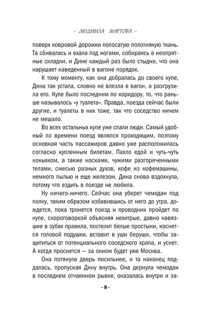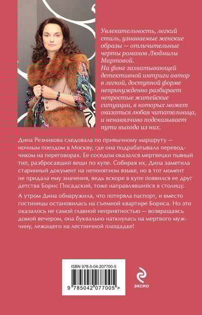 Дина Резникова следовала по привычному маршруту — ночным поездом в Москву, где она подрабатывала переводчиком на переговорах. Ее соседом оказался мертвецки пьяный тип, разбросавший вещи по купе. Собирая их, Дина заметила старинный документ на непонятном языке, но в тот момент не придала ему значения, ведь вскоре в купе появился ее друг детства Борис Посадский, тоже направлявшийся в столицу. А утром Дина обнаружила, что потеряла паспорт, и вместо гостиницы остановилась на съемной квартире Бориса. Но это оказалось не самой главной неприятностью — возвращаясь домой вечером, она буквально наткнулась на мертвого мужчину, лежащего на лестничной площадке! Это был их ночной попутчик, но как он сюда попал и кто его убил?..