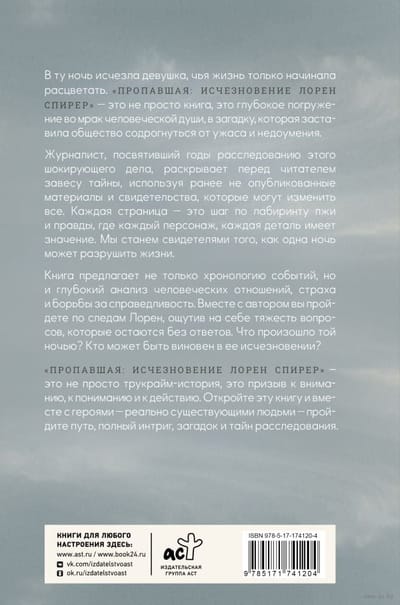 «Пропавшая: Исчезновение Лорен Спирер» — это не просто трукрайм история, это призыв к вниманию, к пониманию и к действию. Откройте эту книгу, и вместе с героями — реально существующими людьми — пройдите путь, полный интриг, загадок и тайн расследования.