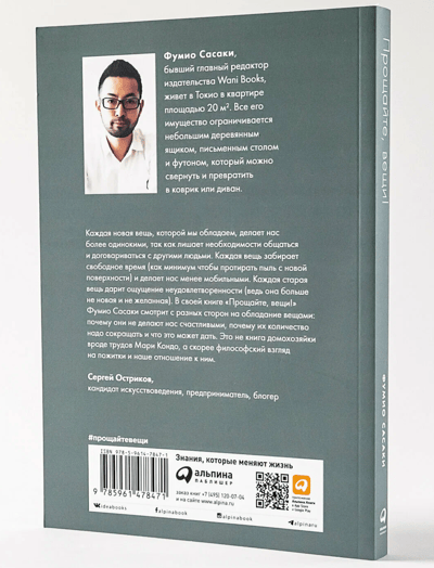 «Прощайте, вещи!» — книга самого известного минималиста в Японии и мировой бестселлер, переведенный на несколько языков. Ее автор Фумио Сасаки — обычный парень, который покупал кучу вещей, полагая, что это повысит его самооценку или сделает его счастливее. Когда он понял, что превратил свое и так небольшое жилище в забитое хламом пространство, то решил, что с него довольно и нужно что-то менять. Сасаки увлекся идеями минимализма и распрощался со многими вещами, которые ему мешали. Эффект оказался поразительным: он научился обходиться малым, стал меньше времени тратить на уборку, больше внимания уделять тому, что действительно важно, — и, по его собственному признанию, обрел истинные свободу и счастье.