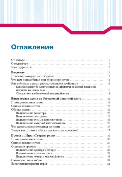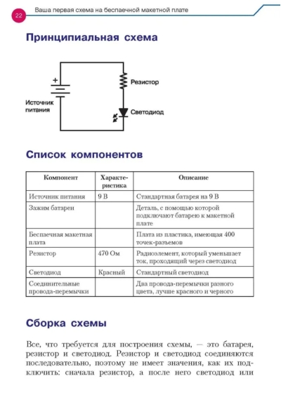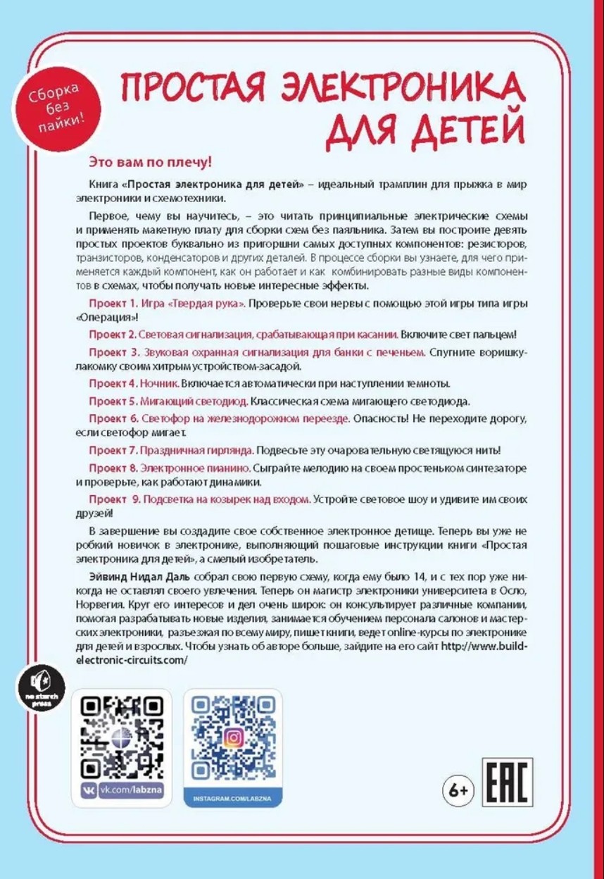 Книга «Простая электроника для детей» — идеальный трамплин для прыжка в мир электроники и схемотехники. Первое, чему вы научитесь, — это читать принципиальные электрические схемы и применять беспаечную макетную плату для сборки схем без паяльника. Затем вы получите огромный практический опыт, собрав девять простых проектов из самых доступных электронных компонентов и микросхем. В процессе сборки вы узнаете, как работает каждый компонент, для чего применяется и какие новые интересные эффекты можно получить, комбинируя разные виды компонентов в схемах.