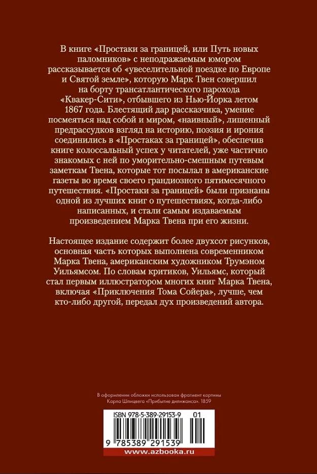 В книге «Простаки за границей, или Путь новых паломников» с неподражаемым юмором рассказывается об «увеселительной поездке по Европе и Святой земле», которую Марк Твен совершил на борту трансатлантического парохода «Квакер-Сити», отбывшего из Нью-Йорка летом 1867 года. Блестящий дар рассказчика, умение посмеяться над собой и миром, «наивный», лишенный предрассудков взгляд на историю, поэзия и ирония соединились в «Простаках за границей», обеспечив книге колоссальный успех у читателей, уже частично знакомых с ней по уморительно-смешным путевым заметкам Твена, которые тот посылал в американские газеты во время своего грандиозного пятимесячного путешествия. «Простаки за границей» были признаны одной из лучших книг о путешествиях, когда-либо написанных, и стали самым издаваемым произведением Марка Твена при его жизни.