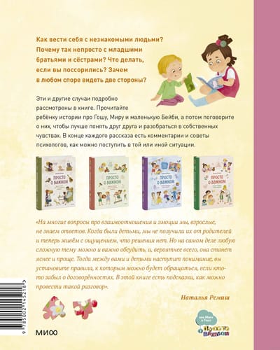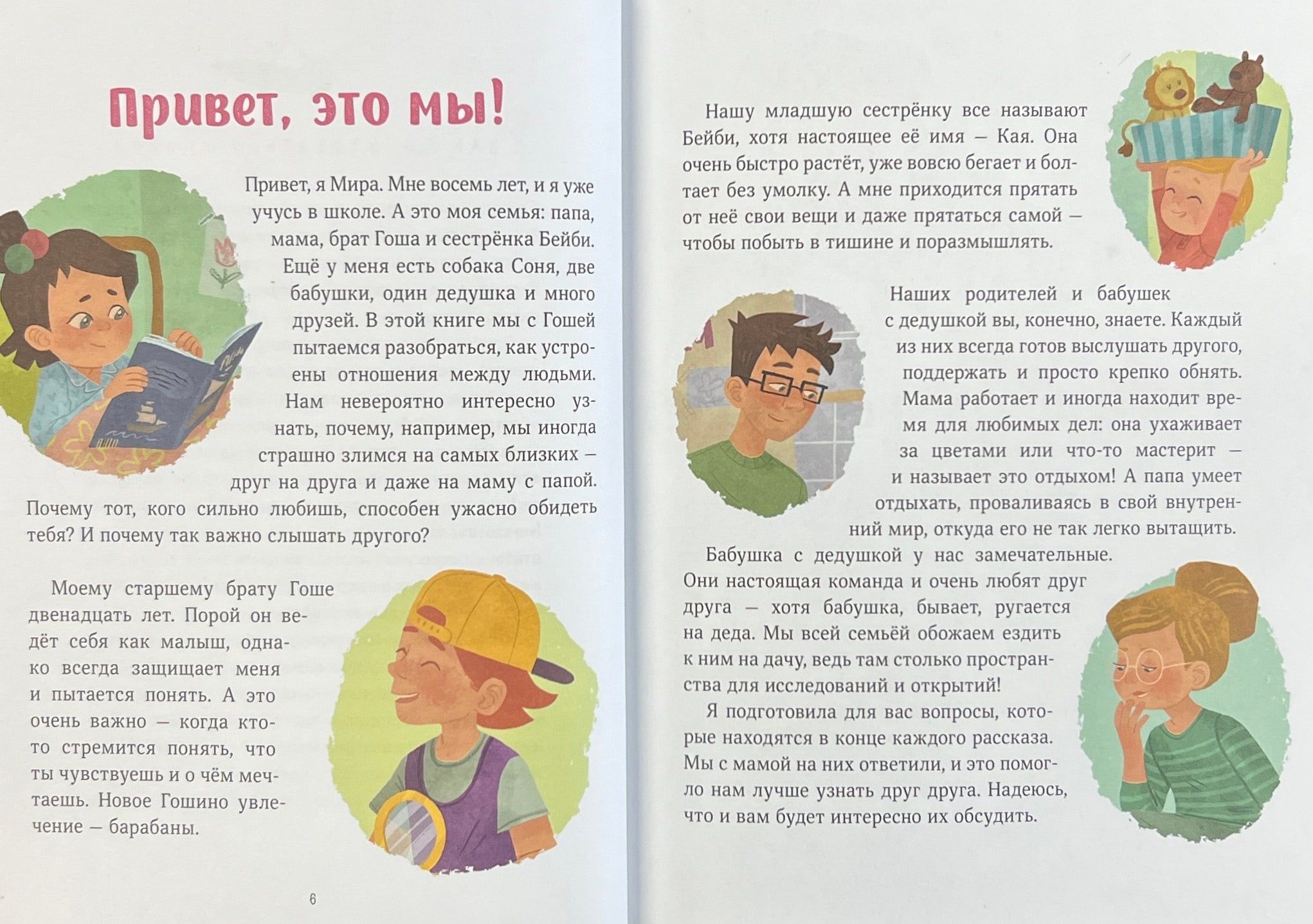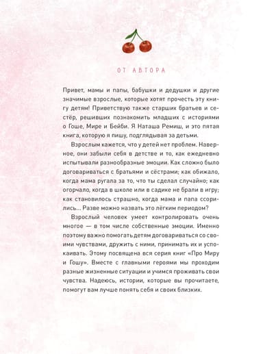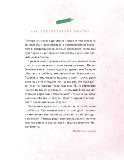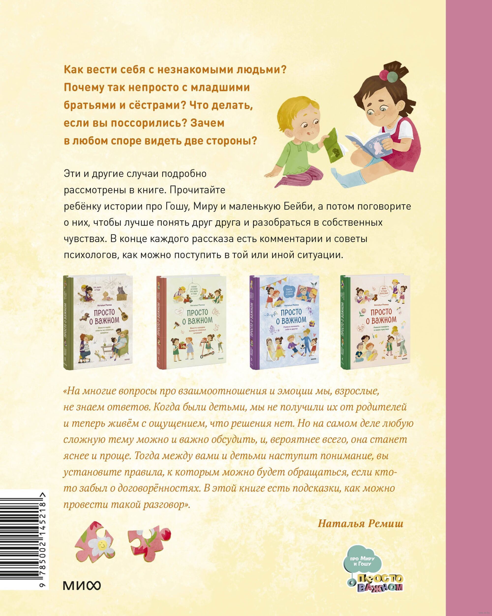 В книге вы найдёте ответы на эти и многие другие вопросы. Прочитайте ребёнку истории про Гошу, Миру и маленькую Бейби, а потом обсудите их, чтобы лучше понять друг друга и разобраться в собственных эмоциях и чувствах. В конце каждого рассказа есть комментарии и советы психологов, как лучше поставить в той или иной ситуации. «‎На многие вопросы про взаимоотношения и эмоции мы, взрослые, не знаем ответов. Когда мы были детьми, мы не получили эти ответы от своих родителей, и теперь живем с ощущением, что решения нет. Но на самом деле, любую сложную тему можно и важно обсудить, и вероятнее всего она станет понятнее и проще. Тогда между вами и детьми наступит понимание, вы установите правила, к которым можно будет обращаться, если кто-то из вас забыл о договоренностях. В этой книге есть подсказки, как можно такой разговор провести»‎ Наталья Ремиш.