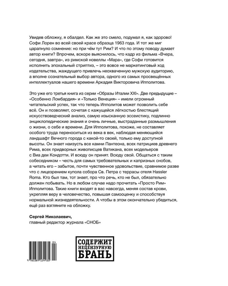 Аркадий Ипполитов – хранитель кабинета итальянской гравюры в Государственном Эрмитаже, крупнейший знаток и тонкий ценитель итальянской истории и культуры. Герой его книги – Рим, удивительный город, город Великого Стиля. На страницах мелькает множество персонажей: папы и императоры, величайшие художники и гениальные архитекторы, обворожительные красавицы и неотразимые авантюристы – блистательная свита Вечного города. Непринуждённая легкость талантливого писателя, к тому же обладающего огромными знаниями и безупречным вкусом, наполняет страницы любовью и изящной иронией. Под его пером оживают базилики и дворцы, площади и фонтаны, статуи и картины. Они также становятся персонажами – у каждого своя история, своя судьба, но весь пёстрый калейдоскоп разнообразных отдельных рассказов сливается в единое повествование, которое иначе как романом не назовёшь. Особенность творческого метода Аркадия Ипполитова — энциклопедическая осведомленность, блестящий литературный стиль, а также свободное, ассоциативное мышление, позволяющее ему без видимых усилий перелетать из одной эпохи в другую, выстраивать смелые и остроумные концепции, раскрывать тайные коды в истории мирового искусства.
