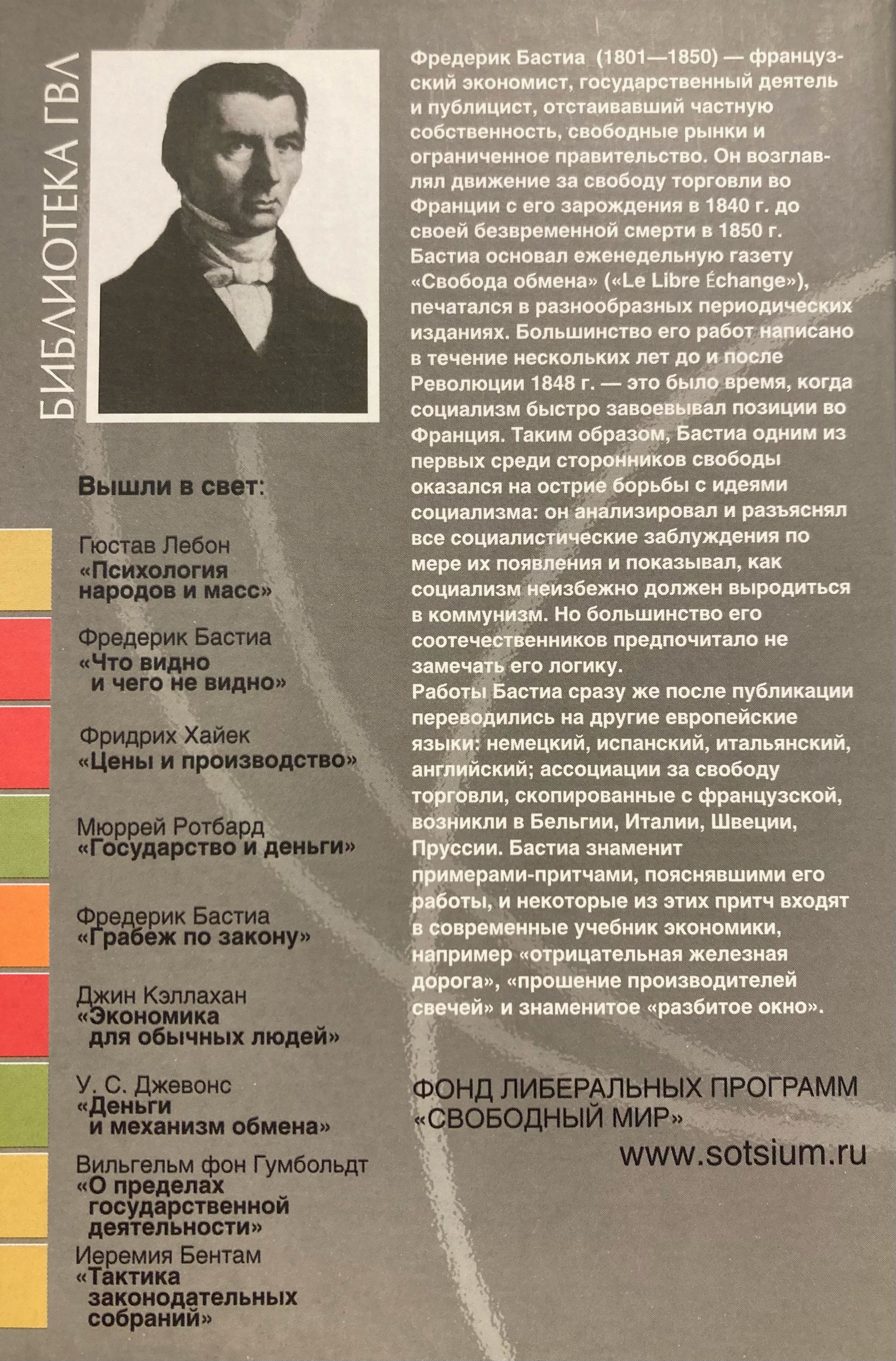 Фредерик Бастиа (1801-1850) - французский экономист, государственный деятель и публицист, отстаивавший частную собственность, свободные рынки и ограниченное правительство. Он возглавлял движение за свободу торговли во Франции с его зарождения в 1840 г. до своей безвременной смерти в 1850 г. Бастиа основал еженедельную газету «Свобода обмена» («Le Libre Echange»), печатался в разнообразных периодических изданиях. Большинство его работ написано в течение нескольких лет до и после Революции 1848 г. - это было время, когда социализм быстро завоевывал позиции во Франция. Таким образом, Бастиа одним из первых среди сторонников свободы оказался на острие борьбы с идеями социализма: он анализировал и разъяснял все социалистические заблуждения по мере их появления и показывал, как социализм неизбежно должен выродиться в коммунизм. Но большинство его соотечественников предпочитало не замечать его логику.