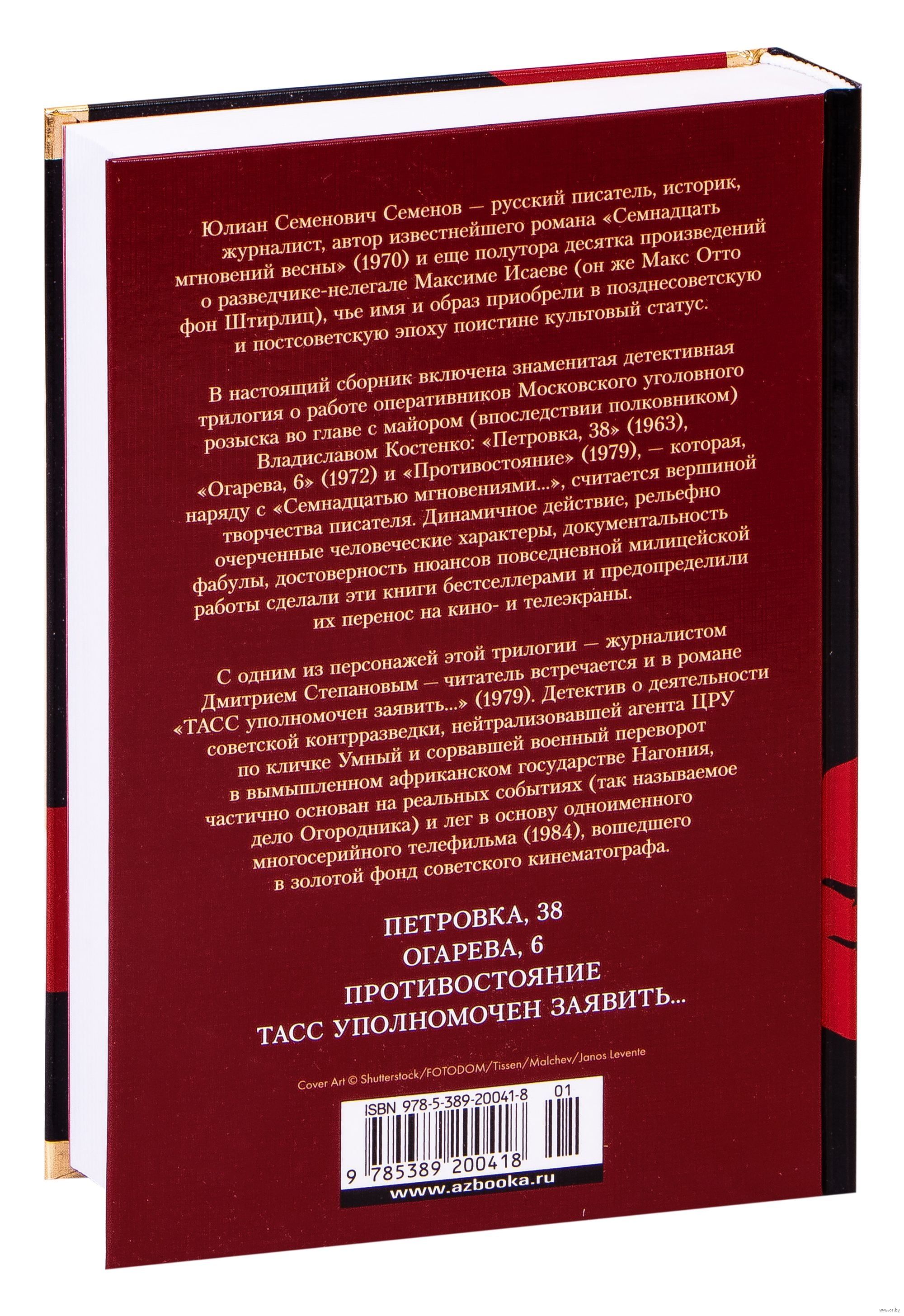 Юлиан Семенович Семенов – русский писатель, историк, журналист, автор знаменитого романа «Семнадцать мгновений весны» (1970) и еще полутора десятка произведений о разведчике-нелегале Максиме Исаеве (он же Макс Отто фон Штирлиц), чье имя и образ приобрели в позднесоветскую и постсоветскую эпоху поистине культовый статус. Однако, помимо романов о Штирлице, Ю. Семеновым написано несколько прозаических циклов с участием других героев – в том числе включенная в настоящий сборник детективная трилогия о работе оперативников Московского уголовного розыска во главе с майором (впоследствии полковником) Владиславом Костенко: «Петровка, 38» (1963), «Огарева, 6» (1972) и «Противостояние» (1979), считающееся, наряду с «Семнадцатью мгновениями…», вершиной творчества писателя. Динамичное действие, рельефно очерченные человеческие характеры, документальность фабулы, достоверность нюансов повседневной милицейской работы сделали эти книги бестселлерами и предопределили их перенос на кино- и телеэкраны. С одним из персонажей этой трилогии – журналистом Дмитрием Степановым – читатель встречается и в романе «ТАСС уполномочен заявить…» (1979). Детектив о деятельности советской контрразведки, нейтрализовавшей агента ЦРУ по кличке Умный и сорвавшей военный переворот в вымышленном африканском государстве Нагония, частично основан на реальных событиях (так называемое дело Огородника) и лег в основу одноименного многосерийного телефильма (1984), который, как и экранизации других книг писателя, вошел в золотой фонд советского кинематографа.