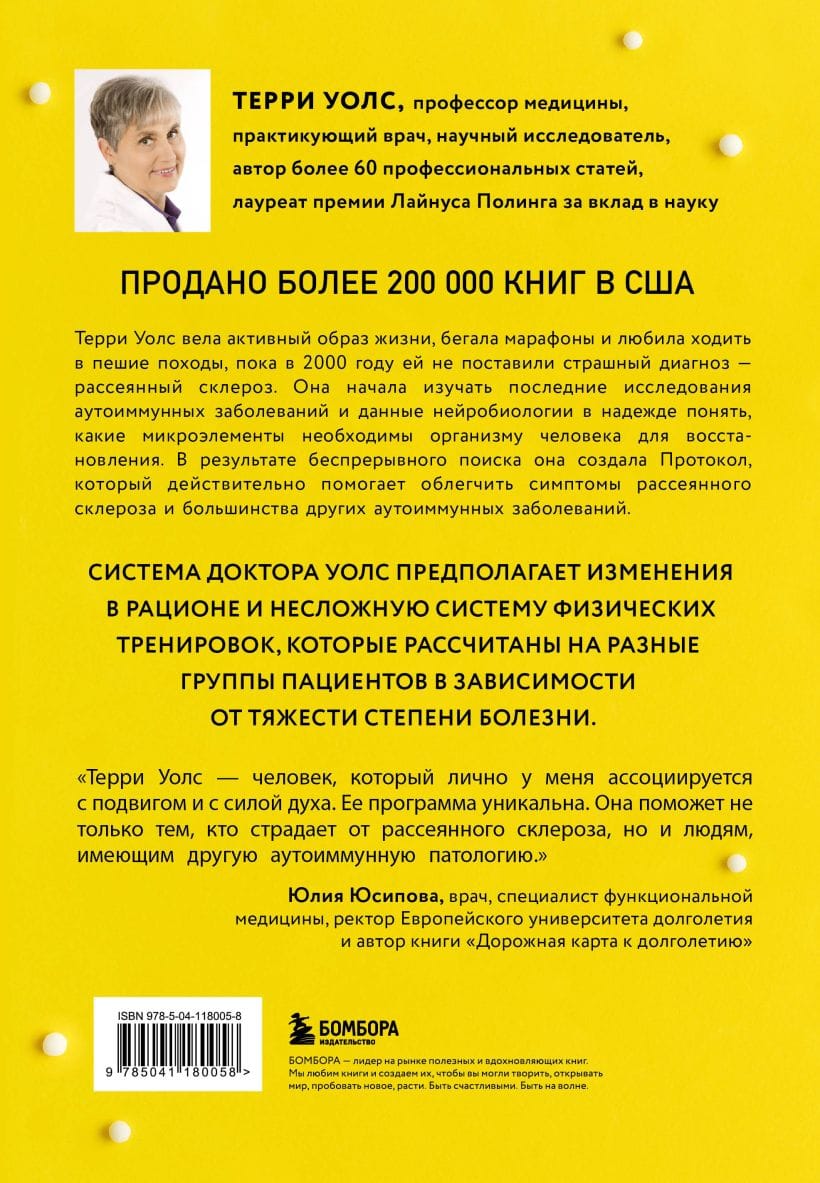 Терри Уолс вела активный образ жизни, бегала марафоны и любила ходить в пешие походы, пока в 2000 году ей не поставили страшный диагноз — рассеянный склероз. Буквально за считанные месяцы она оказалась прикованной к инвалидному креслу, ее тело больше не слушалось ее, а карьера успешного врача шла под откос из-за потери концентрации и вечной усталости — спутников сложной болезни. Будучи настоящим исследователем, Терри Уолс решила не сдаваться и победить страшный диагноз во что бы то ни стало — с кропотливой дотошностью она изучала новейшие исследования и опыты на мышах, а также сутками читала научные статьи. В результате беспрерывного поиска она создала Протокол, который действительно помогает вылечить симптомы рассеянного склероза и большинства других аутоиммунных заболеваний. Система доктора Уолс предполагает изменения в рационе и несложную систему физических тренировок, которые рассчитаны на разные аудитории пациентов в зависимости от тяжести степени болезни. Удивительно вдохновляющая история врача, которая не перестала бороться и изобрела способ вернуть привычную жизнь себе и миллионам людей с тяжелым диагнозом, которые уже были готовы отчаяться и потерять надежду.
