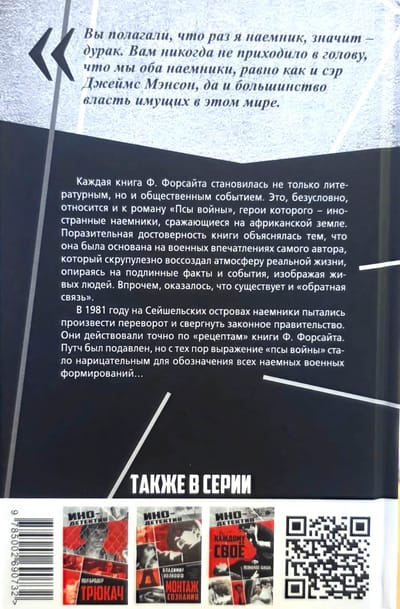Каждая книга Ф. Форсайта становилась не только литературным, но и общественным событием. Это, безусловно, относится и к роману «Псы войны», герои которого - иностранные наемники, сражающиеся на африканской земле. Поразительная достоверность книги объяснялась тем, что она была основана на военных впечатлениях самого автора, который скрупулезно воссоздал атмосферу реальной жизни, опираясь на подлинные факты и события, изображая живых людей. Впрочем, оказалось, что существует и «обратная связь» .В 1981 году на Сейшельских островах наемники пытались произвести переворот и свергнуть законное правительство. Они действовали точно по «рецептам» книги Ф. Форсайта. Путч был подавлен, но с тех пор выражение «псы войны» стало нарицательным для обозначения всех наемных военных формирований...