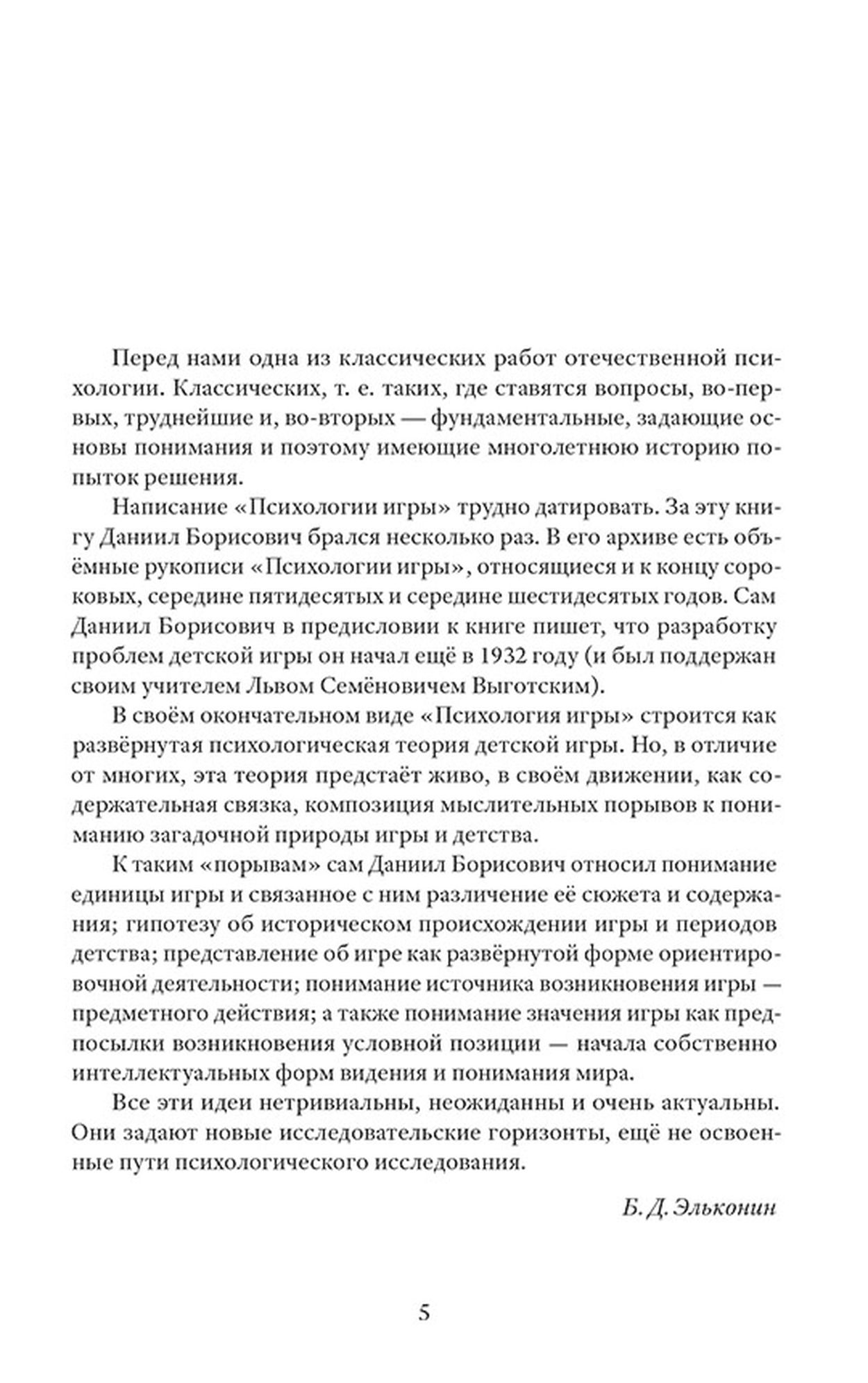 Почему игры так важны для формирования личности ребёнка? Что возникло раньше — игра или труд? Как индивидуальные особенности развития детей влияют на игровую деятельность и какую роль ей отводят отечественные и зарубежные психологи? В основу книги выдающегося отечественного психолога Даниила Эльконина легли теоретические и экспериментальные исследования А. Леонтьева, Л. Запорожца и П. Гальперина. Теория детской игры представлена им в русле культурно-исторической концепции Льва Выготского, где главной мотивацией ребёнка становится подражание взрослым и принятие на себя их роли. Автор выделяет и анализирует 4 периода развития игровой деятельности дошкольника, каждый из которых сопровождается результатами практических наблюдений. Книга рекомендована студентам, аспирантам и специалистам в области психологии, а также воспитателям и родителям детей дошкольного возраста.