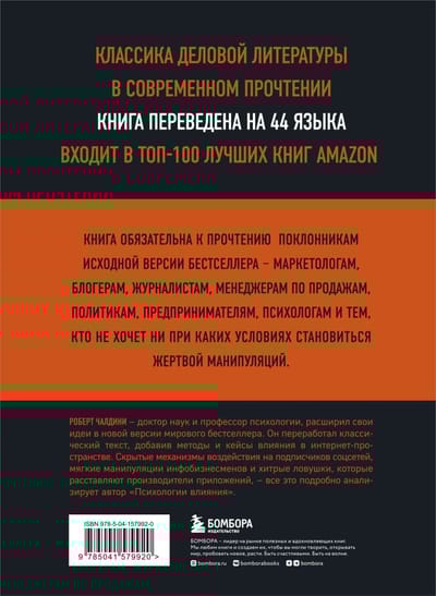 Роберт Чалдини, доктор наук и профессор психологии, расширил свои идеи в новой версии мирового бестселлера. Он переработал классический текст, добавив методы и кейсы влияния в интернет-пространстве. Скрытые механизмы воздействия на подписчиков соцсетей, мягкие манипуляции инфобизнесменов и хитрые ловушки, которые расставляют производители приложений, — все это подробно анализирует автор «Психологии влияния». Книга обязательна к прочтению  поклонникам  исходной версии бестселлера, а также маркетологам, блогерам, журналистам, менеджерам по продажам,  политикам, предпринимателям, психологам и тем, кто не хочет ни при каких условиях становиться жертвой манипуляций.