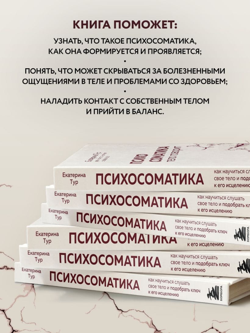 Автор книги «Психосоматика: тело говорит» Екатерина Тур рассказывает, как важно слушать свое тело и уметь распознавать его сигналы. «Иногда болезнь действительно формируется случайно: под действием факторов, генетических поломок или стечения обстоятельств. Но чаще всего телесная боль становится отражением той душевной боли, которую человек носил в себе десятилетиями». Это ценная книга о влиянии наших мыслей и поведения на здоровье всего организма.