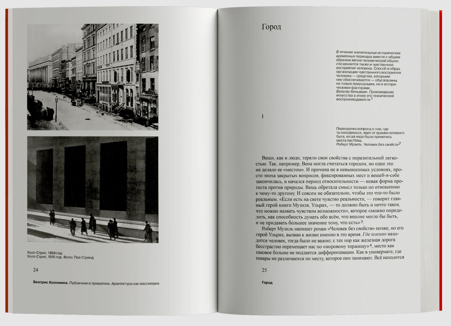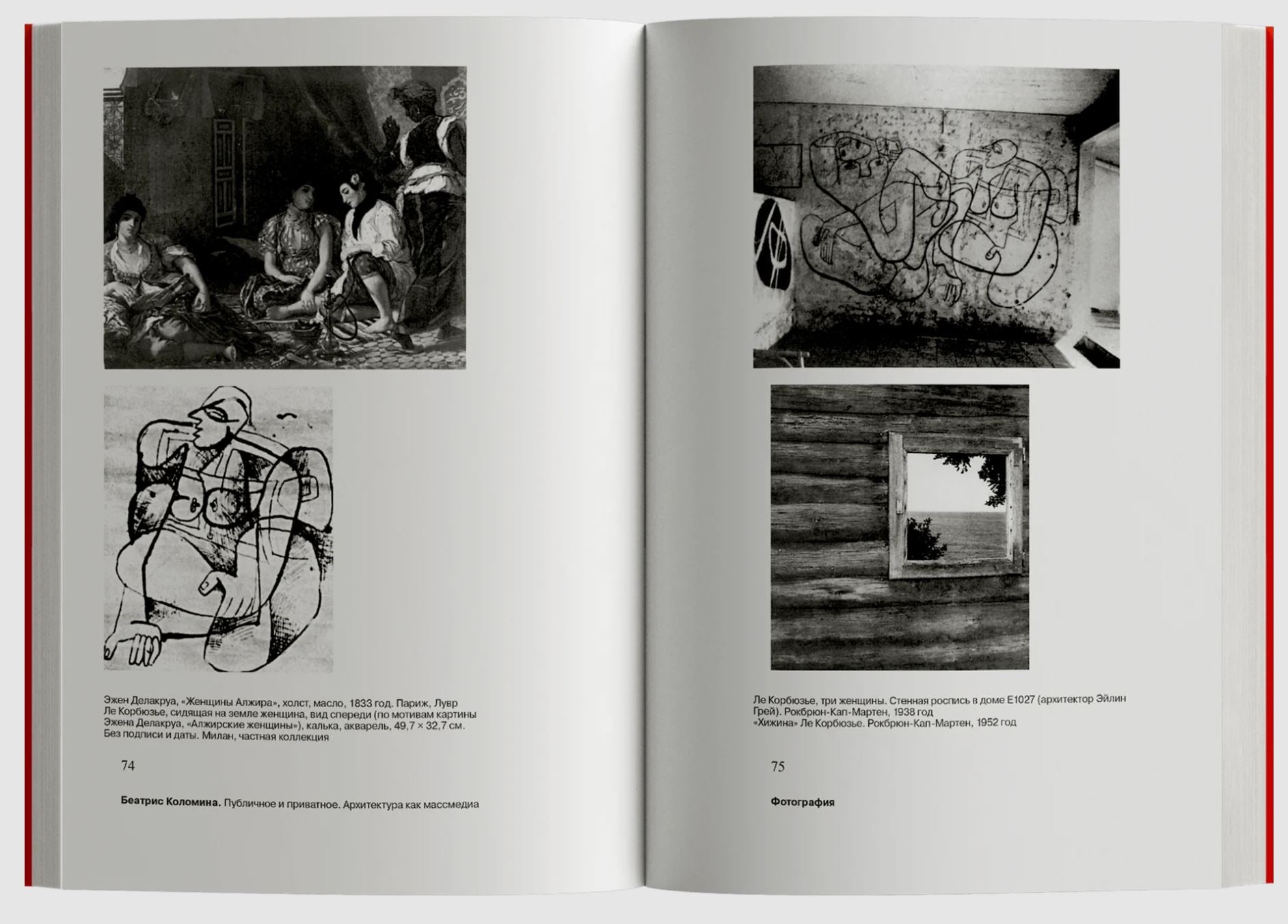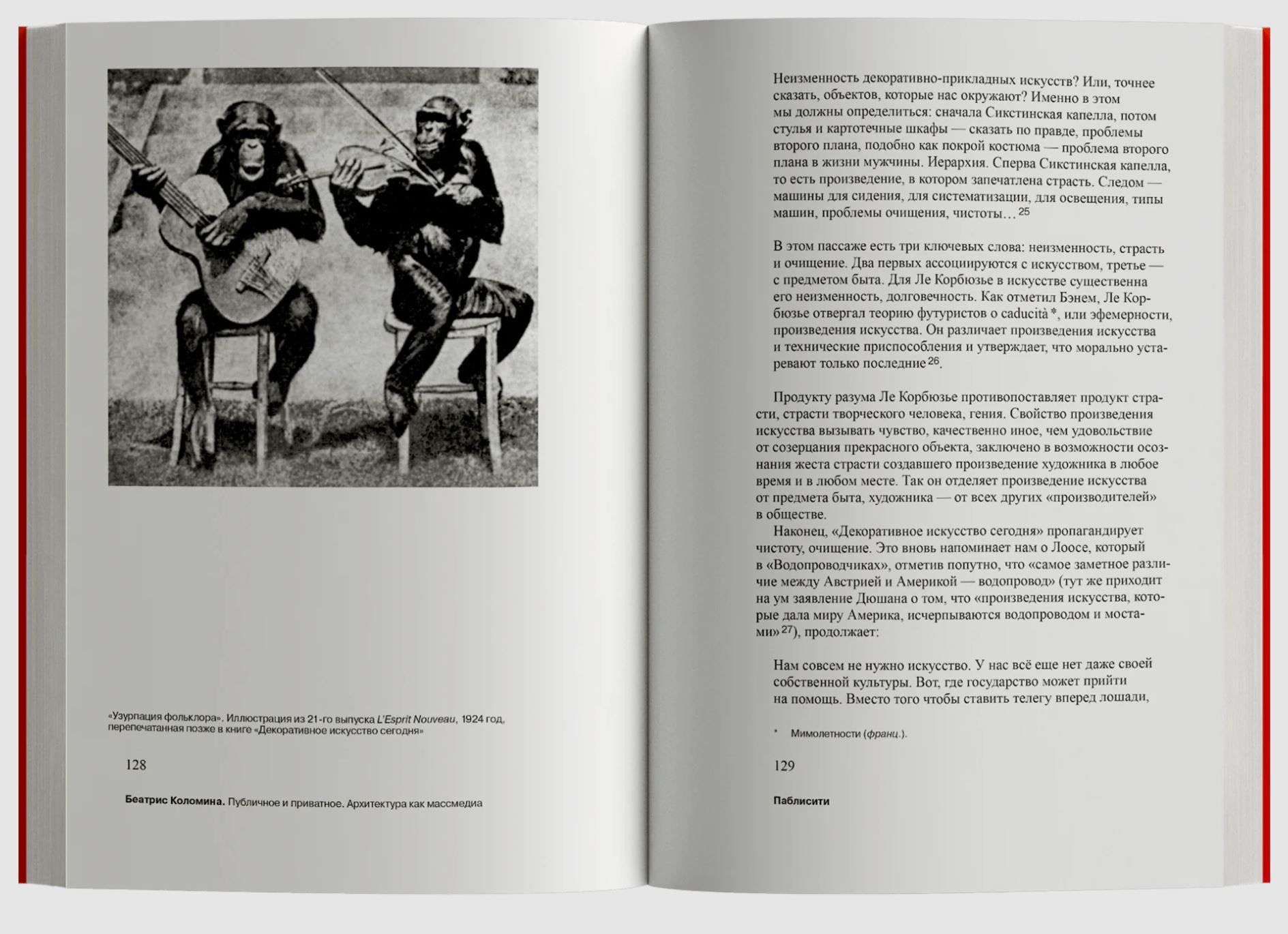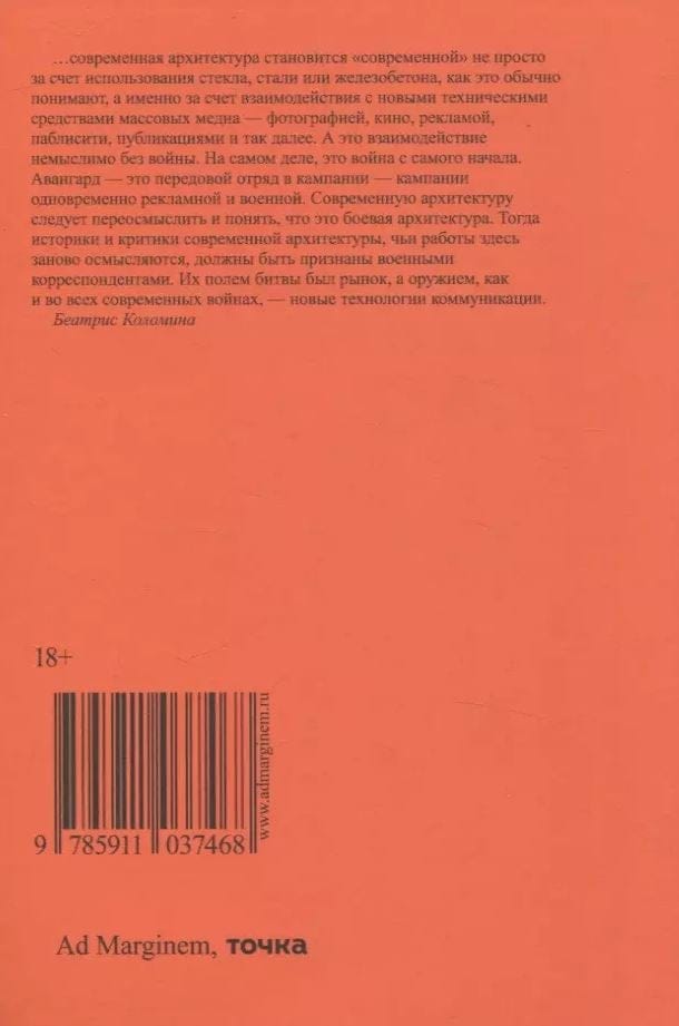 Беатрис Коломина (род. 1952) — теоретик, историк архитектуры и профессор Принстонского университета. В своей книге она исследует феномен современной архитектуры, которая, по ее мнению, является одним из средств массовой информации наряду с рекламой и фотографией. Коломина рассматривает, с одной стороны, проекты Ле Корбюзье — его дома-зрелища, в которых окна становятся камерой-обскурой, а с другой — постройки Адольфа Лооса, обращенные внутрь себя, где экстерьеры — воплощение публичного — лишь «маски», за которыми скрываются интерьеры — воплощение частного. Автор подвергает сомнению статус архитектуры как высокого искусства и задается вопросом: можно ли сегодня провести четкую границу между субъектом и объектом, окном и кинокамерой, публичным и приватным?