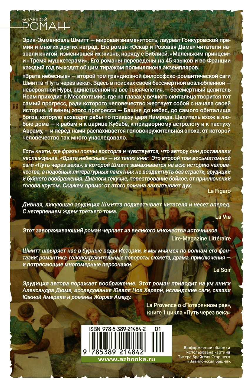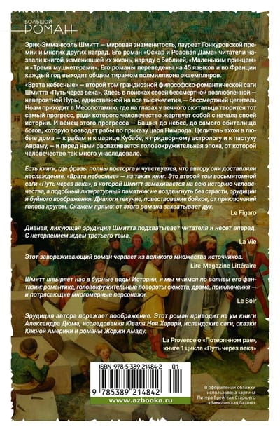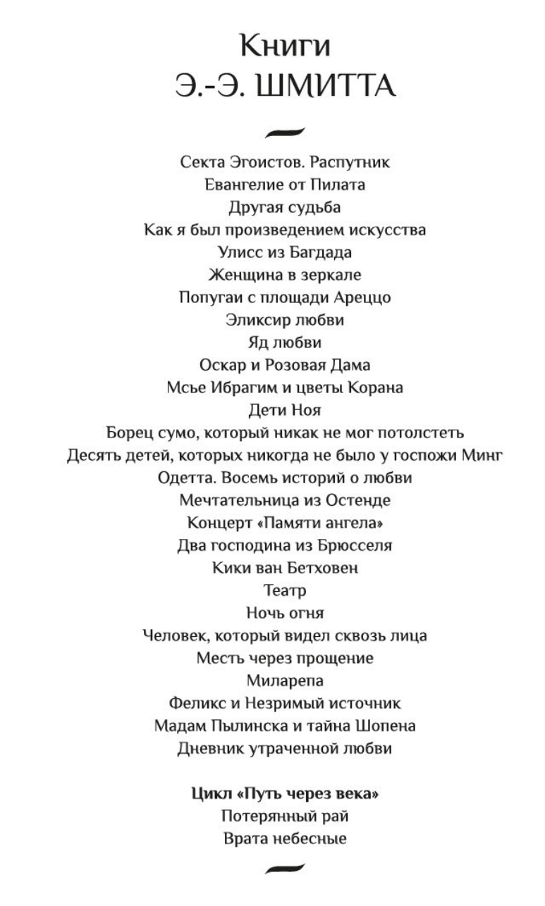 Эрик-Эмманюэль Шмитт — мировая знаменитость, лауреат Гонкуровской премии и многих других наград. Его роман «Оскар и Розовая Дама» читатели назвали книгой, изменившей их жизнь, наряду с Библией, «Маленьким принцем» и «Тремя мушкетерами». Его романы переведены на 45 языков и во Франции каждый год выходят общим тиражом полмиллиона экземпляров. «Врата небесные» — второй том грандиозной философско-романтической саги Шмитта «Путь через века».