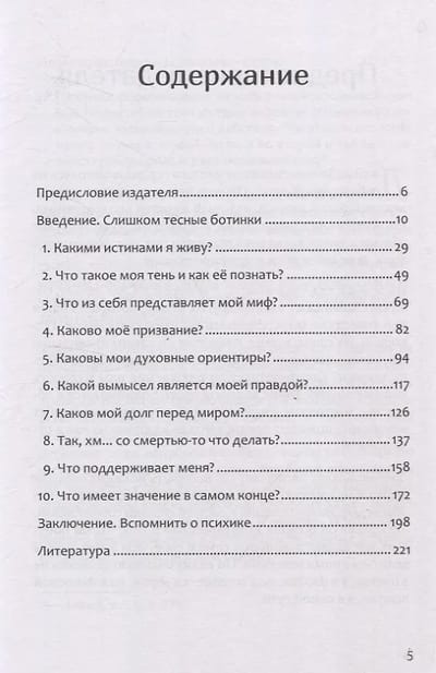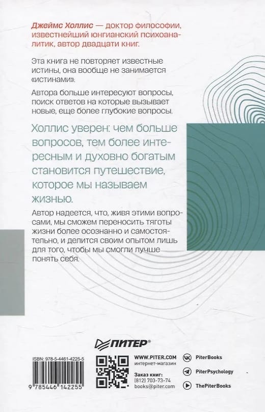 Эта книга не повторяет известные истины, она вообще не занимается «‎истинами»‎. Автора больше интересуют вопросы, поиск ответов на которые вызывают новые, еще более глубокие вопросы. Холлис уверен: чем больше вопросов, тем более интересным и духовно богатым становится путешествие, которое мы называем жизнью. Автор делится своим опытом лишь для того, чтобы мы смогли лучше понять себя, и надеется, что, живя этими вопросами, мы сможем переносить тяготы жизни более осознанно.