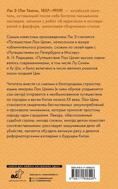 Читатель вместе со смелым и благородным странствующим лекарем Лао Цанем (в чьём образе угадывается сам автор) отправится в необыкновенное путешествие по городам и весям Китая начала XX века. Лао Цань становится свидетелем бесчисленных злоупотреблений и произвола чиновников, которые приносят простому народу одни страдания. Лекарь, обеспокоенный судьбой страны, иногда словом, иногда делом помогает соотечественникам: расследует нашумевшее дело об убийстве, пытается обуздать великую реку и делится реформаторскими взглядами о будущем Китая.